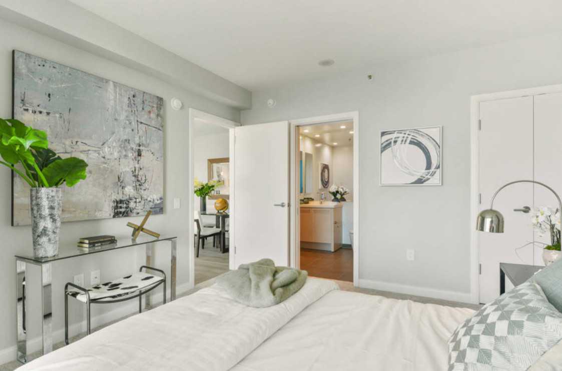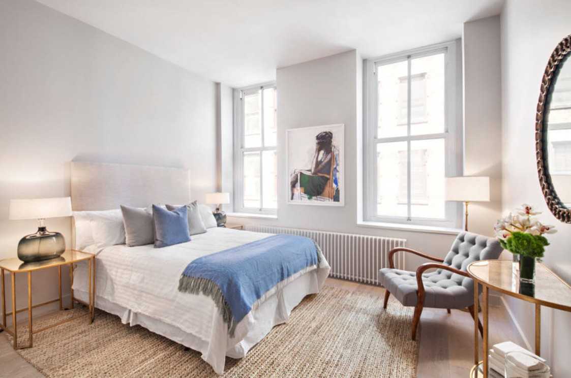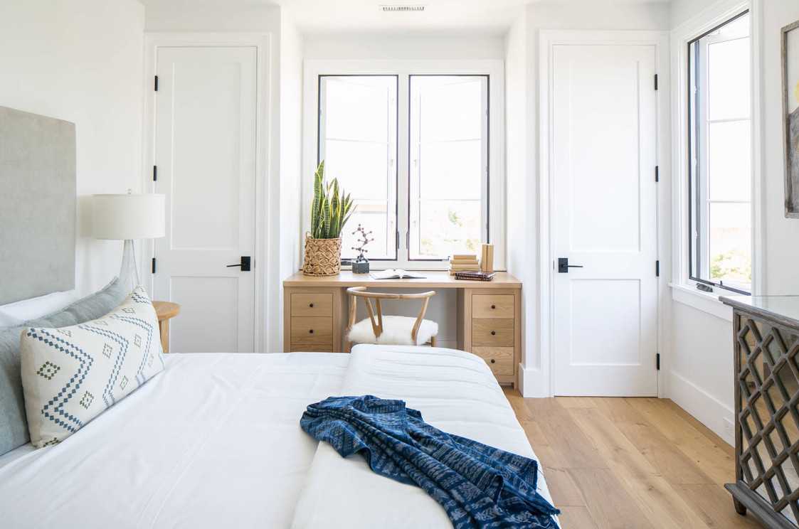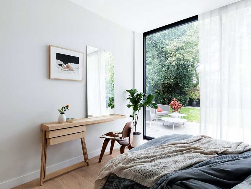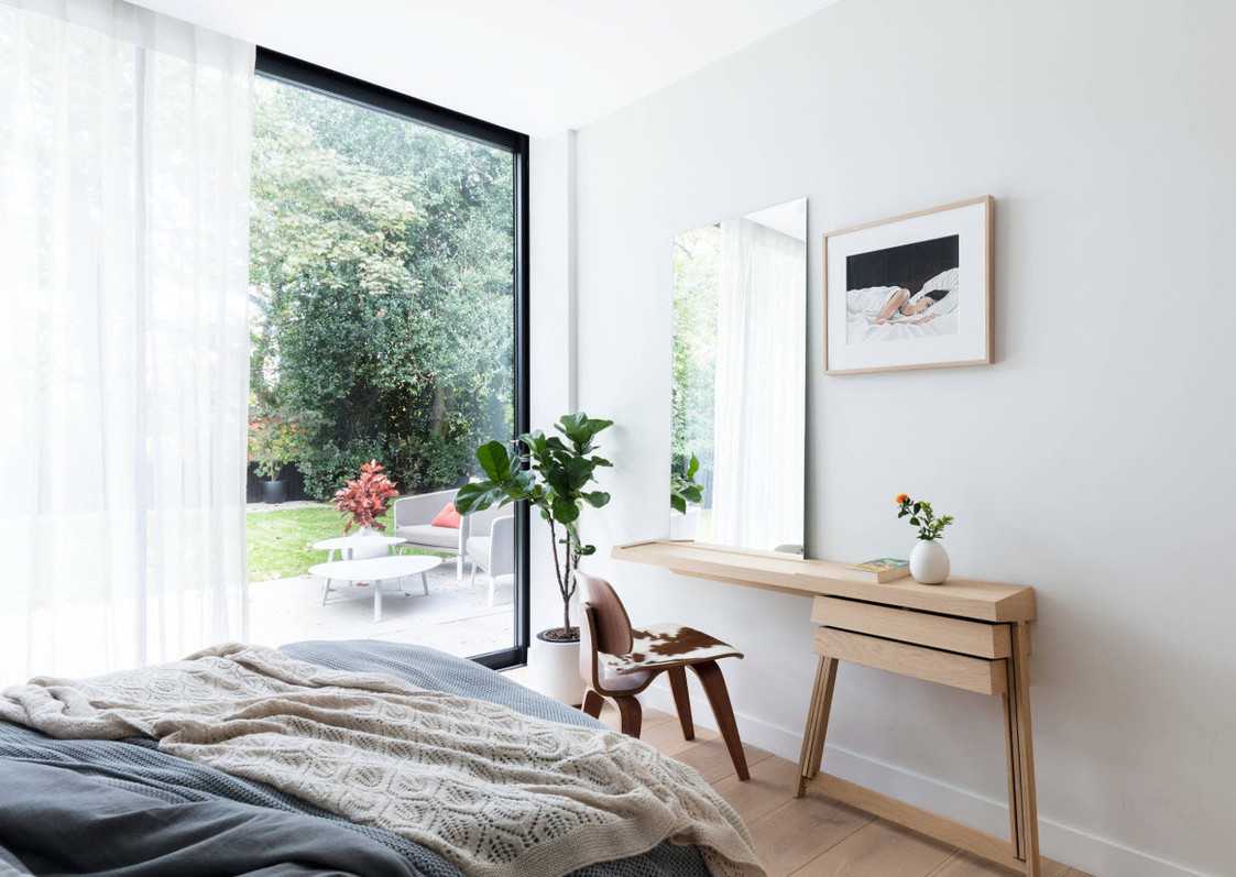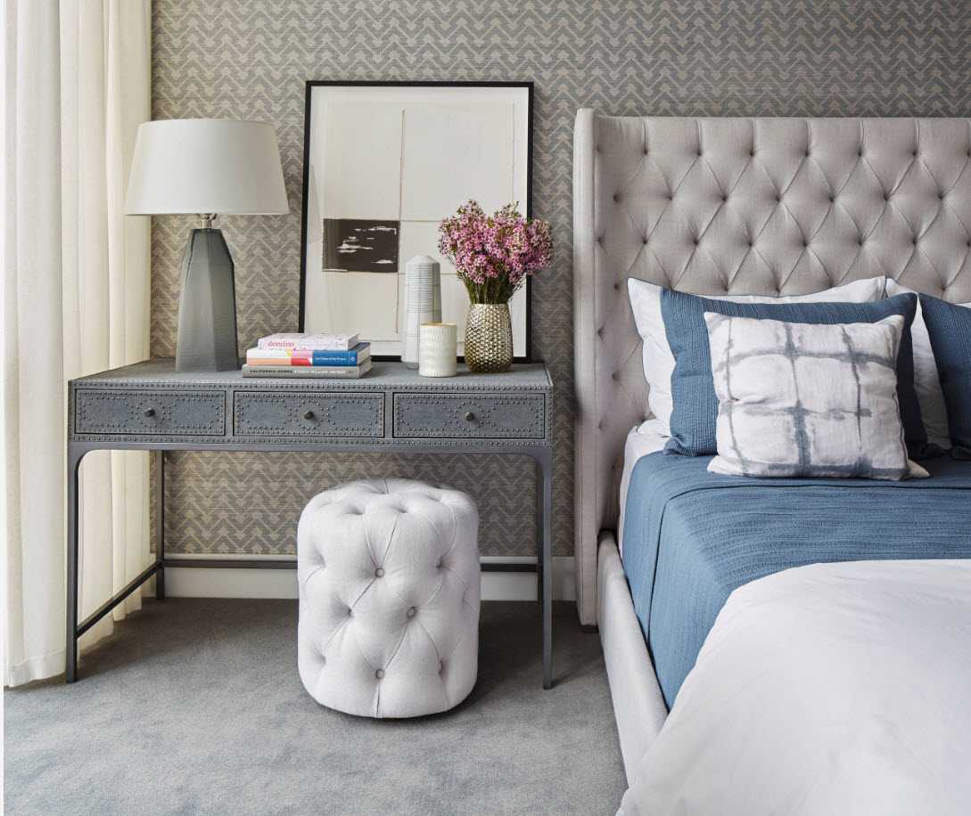 На фото спальня с небольшим туалетным прикроватным столиком белого цвета.