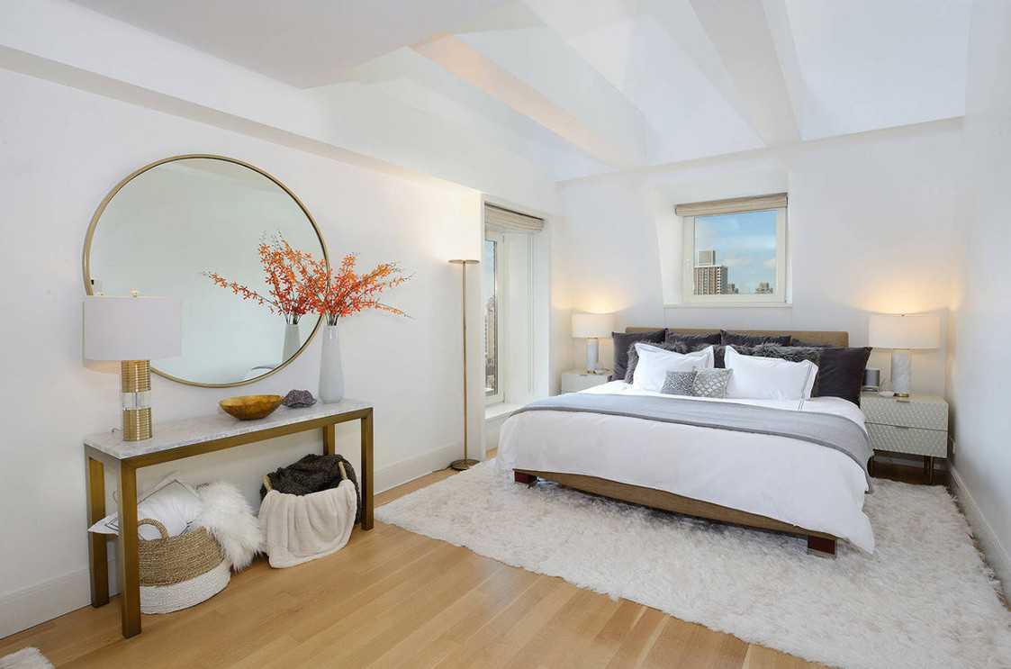 Очень часто в современном дизайне встречается зеркало над кроватью в спальне. Такое размещение несет исключительно декоративный характер. Правильно подобранная геометрическая форма, отделка зеркала и стиль рамы способны освежить любое помещение.
