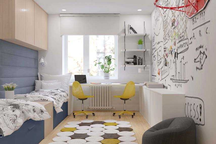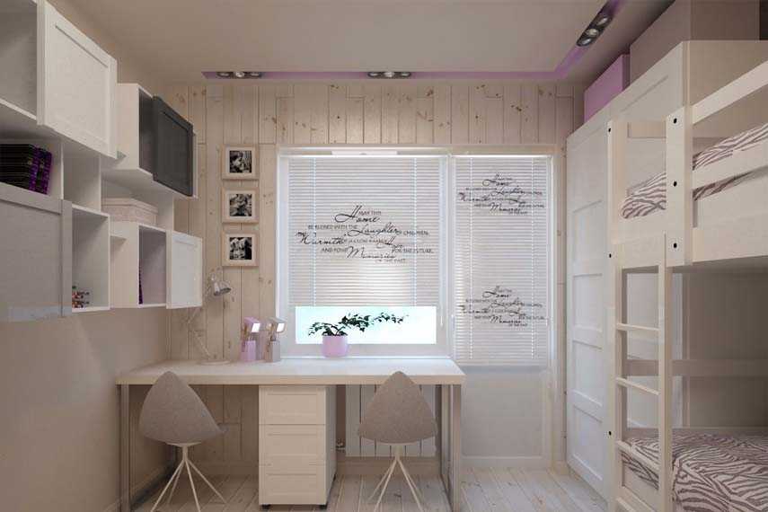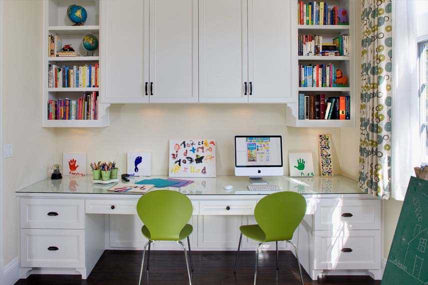 Еще одним интересным вариантом станет встроенный рабочий уголок для двоих детей. Его можно будет легко скрыть, закрыв двери