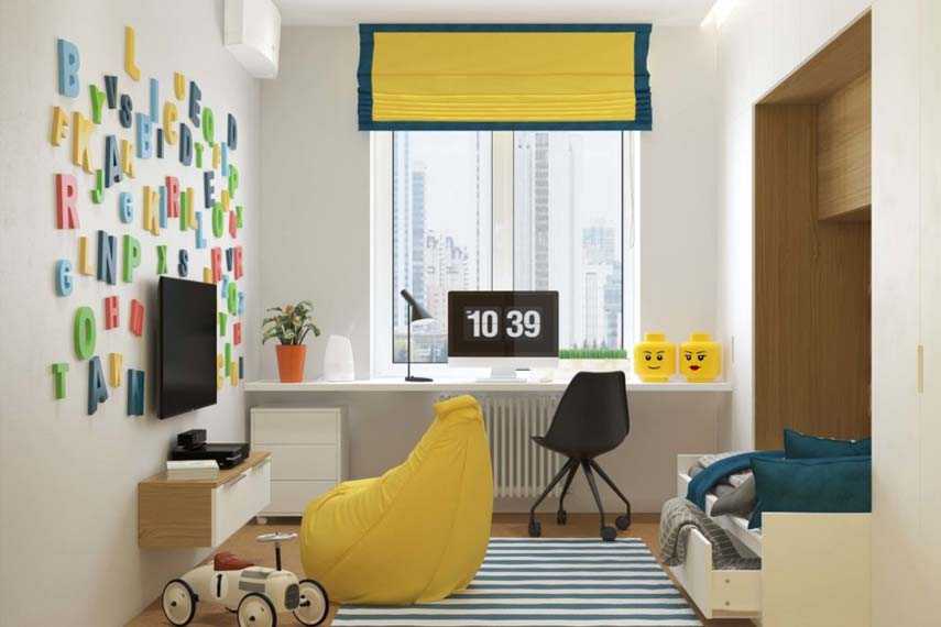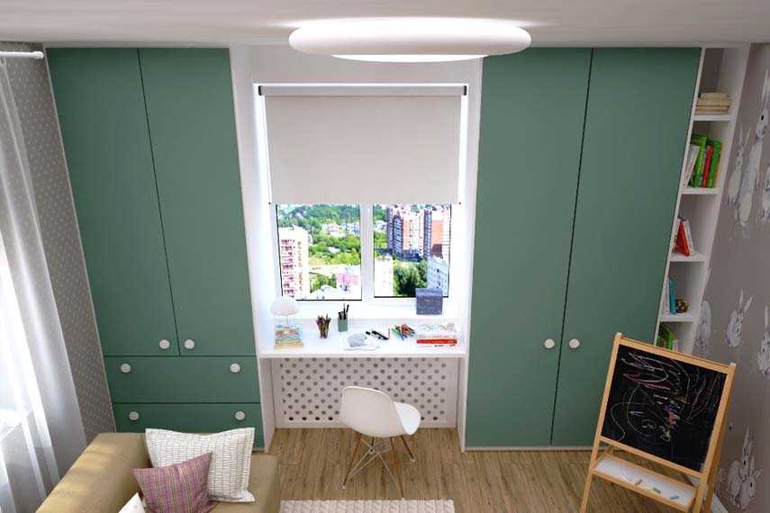 В малогабаритной детской стоит подумать о совмещении подоконника со столом. Это позволит выиграть драгоценное пространство, чтобы оставить чуть-чуть места для игр