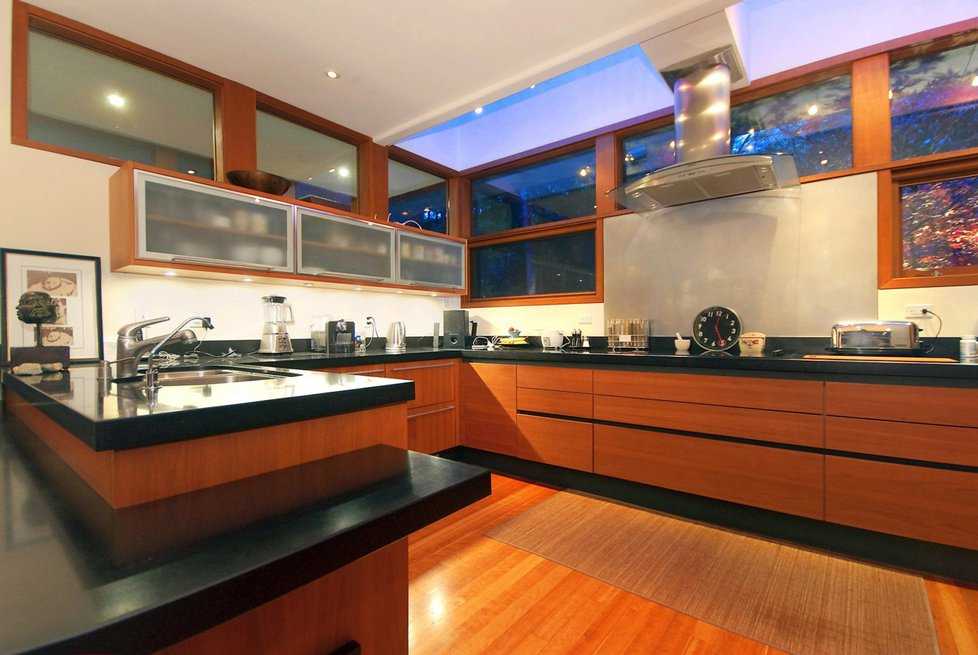 Кухня разделена на две зоны — обеденную и рабочую. Её оснащённость впечатляет. Многие приборы и приспособления спрятаны за панелями.