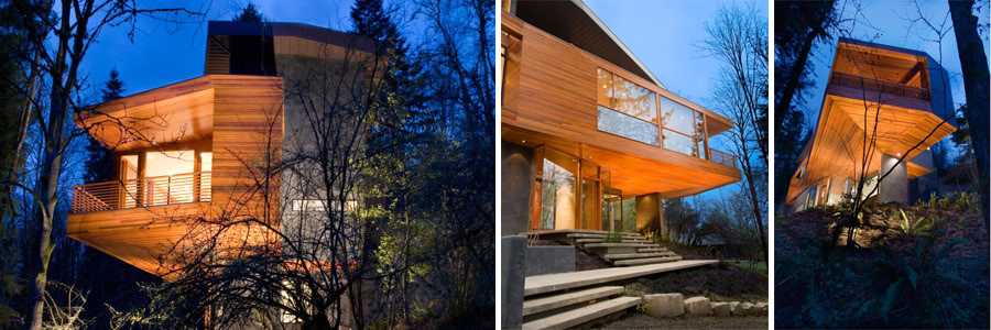 Современные вампиры должны жить в современном доме. Каллены наверняка отлично провели время на вилле Джона Хоука. Дизайнеры проделали удивительную работу: помимо великолепного дизайна, в доме Калленов они использовали элементы «зелёной архитектуры». Использование экологичных материалов очень уместно при постройке здания в лесной местности.
