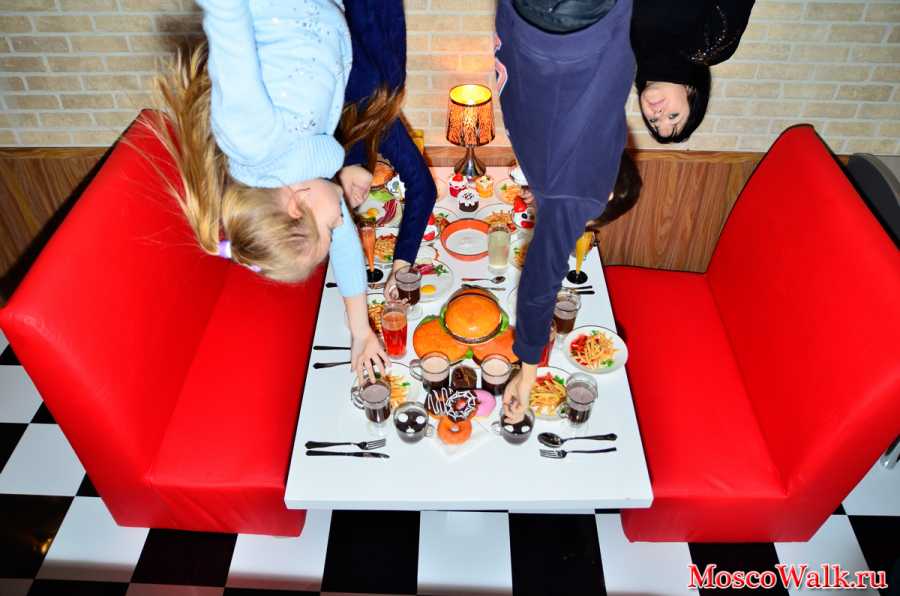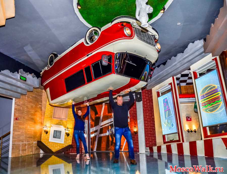 После проникновения внутрь посетителей ждут новые сюрпризы – все, что должно находиться на своих местах, расположено далеко вверху. Столы, стулья, даже горшки с цветами – все закреплено над головой, создавая невероятно сложную и нереалистичную картинку. Довольно сложно привыкнуть к такому новшеству, поэтому большинство гостей, надолго замирает почти у самого порога, решая для себя, где именно они находятся и все ли у них в порядке с сознанием.