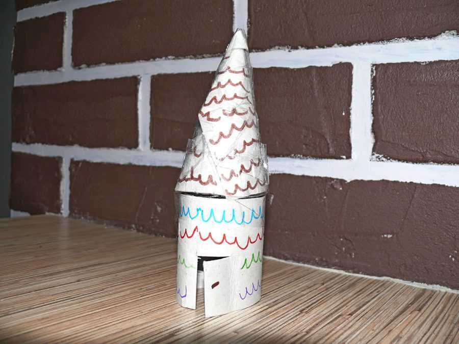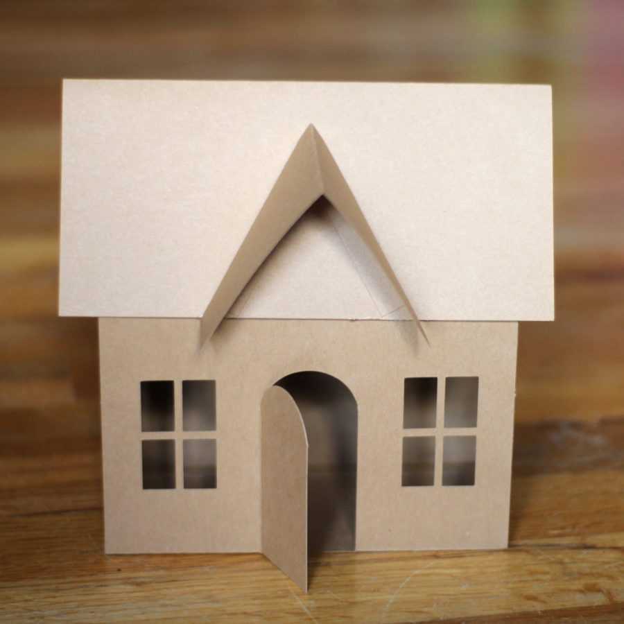 Последовательность действий такова. Сначала сделайте фундамент, на котором будет стоять конструкция. Домик сделайте из коробки, подготовив квадрат 40х40 см. Элементы дома также вырежьте из картона, после чего соедините скотчем. Затем прикрепите к основе.