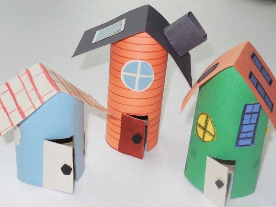 Разберем поделку домика пошагово. Для того, чтобы домики были разной высоты, одни втулки мы оставим целыми, от других отрежем несколько сантиметров, третьи разрежем пополам.