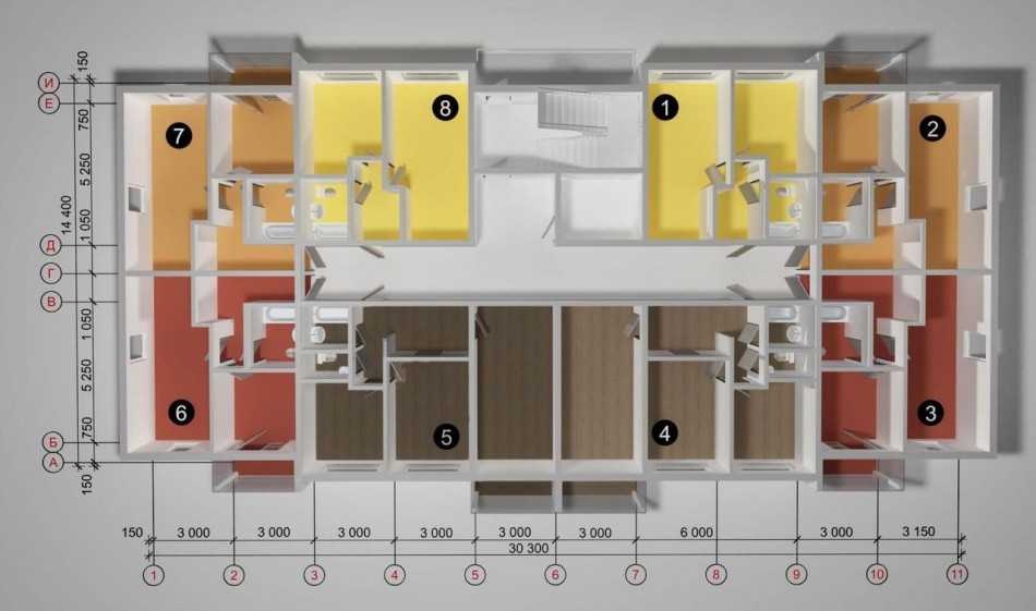 Среди всего многообразия многоэтажных домов, трехэтажки относятся к малоквартирной группе. Пространство можно распланировать так, что каждый этаж делится на несколько изолированных двух-трехкомнатных квартир, количество которых зависит от разбивки длины дома на подъезды.