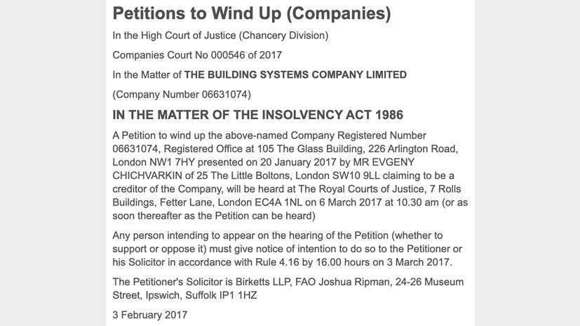 Так, в лондонской The Gazette от 8 февраля 2017 года было опубликовано объявление о рассмотрении Высоким судом ходатайства о ликвидации компании The Building Systems Company Limited. Проживающий по адресу Little Boltons, 25 Евгений Чичваркин значился в этом объявлении одним из кредиторов компании.