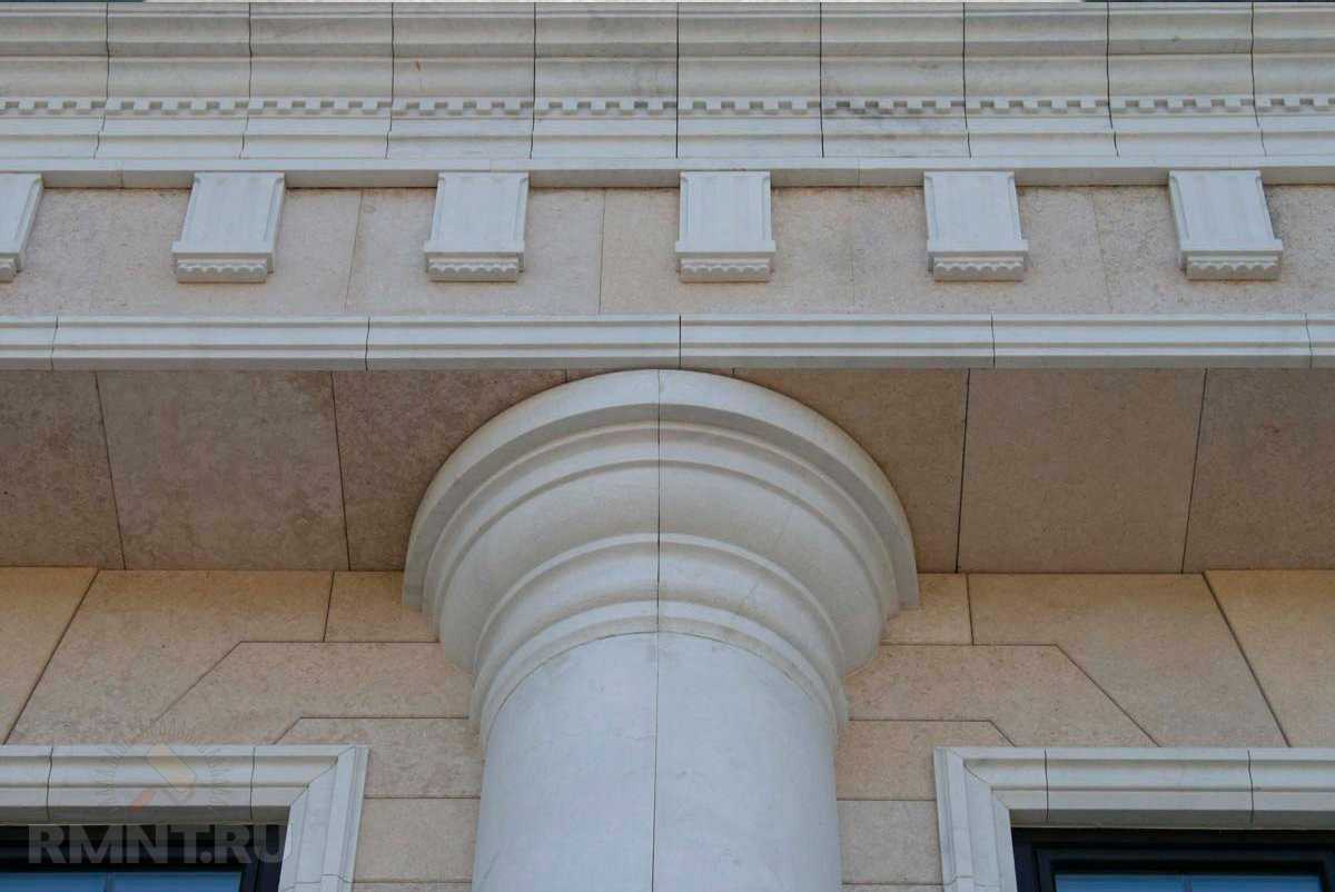 Отделка дагестанским камнем смотрится наиболее изящно при контурировании фасада рельефными элементами. Традиционно внешние, а иногда и внутренние углы оформляют рустами. Для этих целей производители поставляют широкие камни, которые укладываются вертикальными полосами с небольшим отступом при отсутствии фаски или вплотную при её наличии. При прямых гранях камней их сходящиеся на углах стыки формируются косым подрезом.