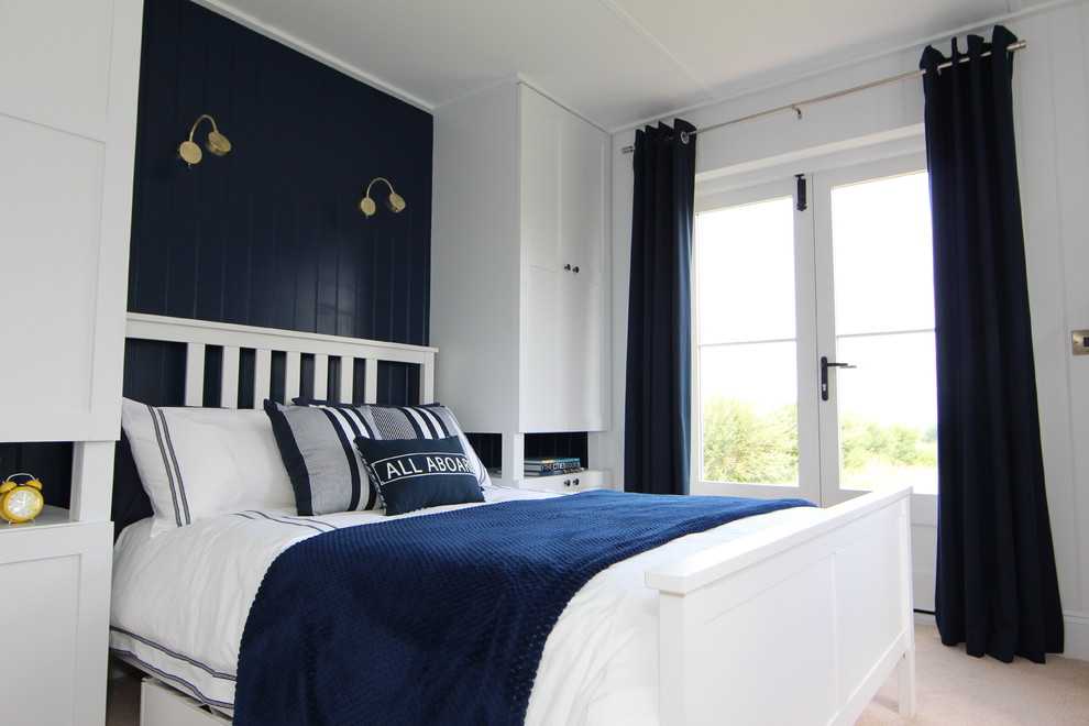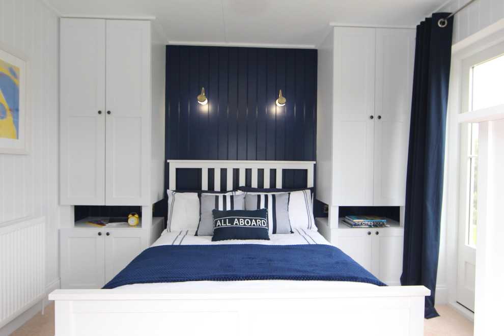 Белоснежная отделка мебели и стен в сочетании с тёмно-синими элементами создают ощущение свежести и чистоты в этой спальне.