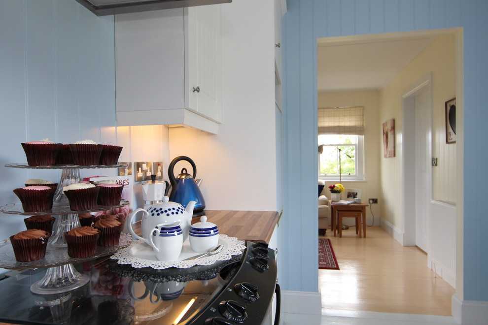 Было решено не занимать стену над раковиной шкафами, чтобы сохранить чувство открытости и свободы. Дженнифер решила, что белый гарнитур будет как нельзя лучше смотреться на фоне нежно-голубых стен.