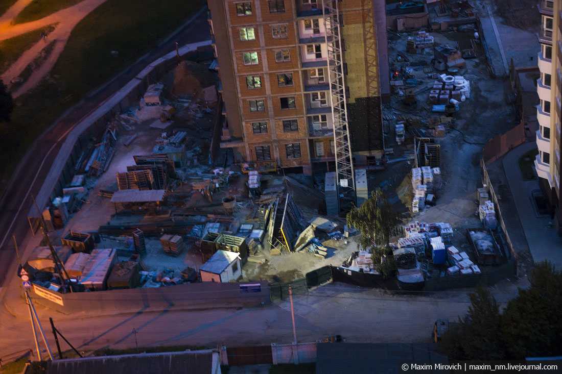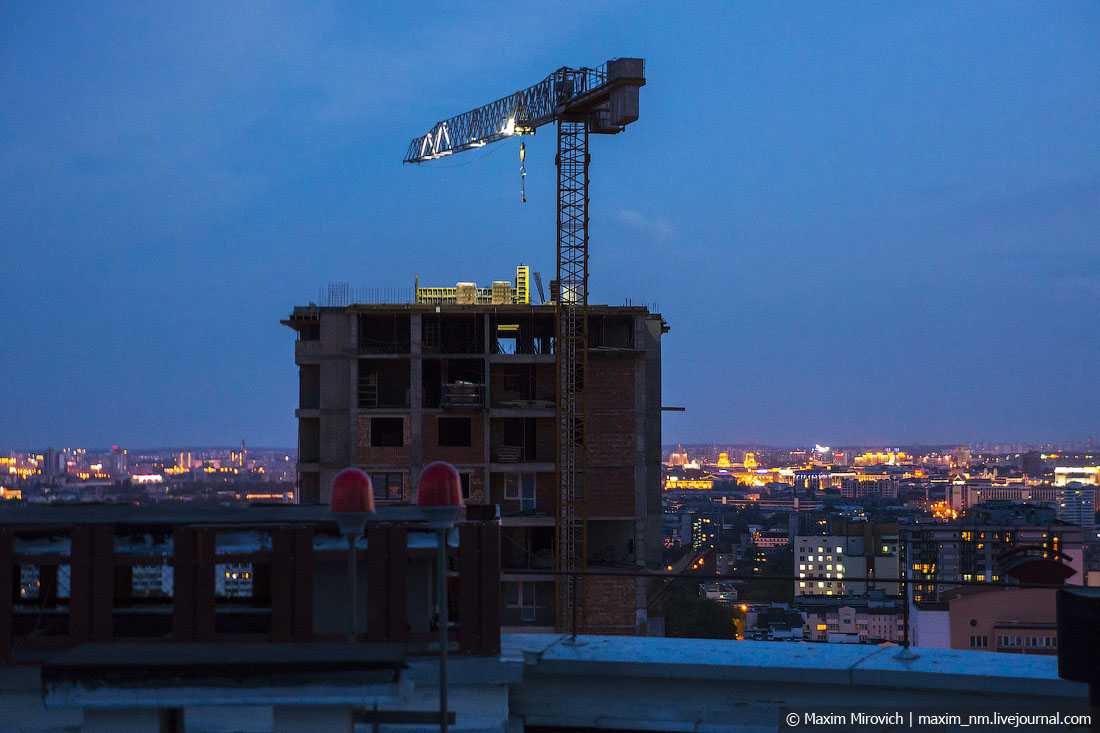 17. Стройка соседней высотки. На башенном кране горят специальные огни, подсвечивающие стрелу.