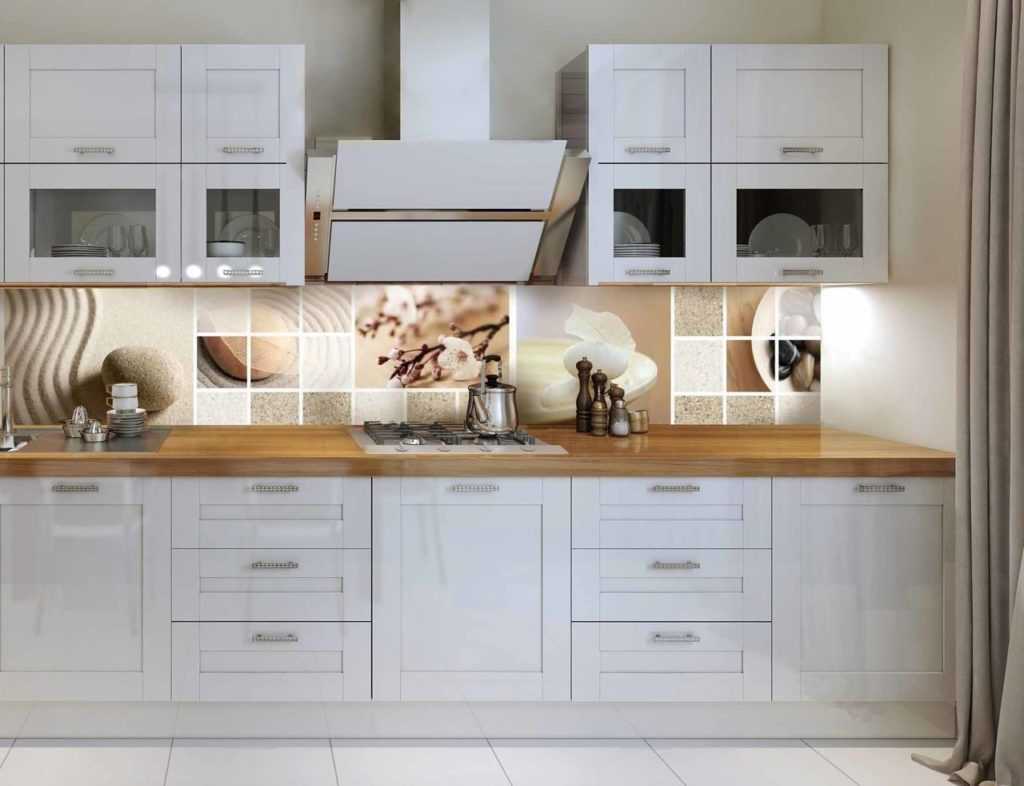 Ещё один способ сделать белый цвет гарнитура более интересным – украсить простенок орнаментами. Это может быть плитка с цветочными узорами, геометрическими фигурами или пэчворк