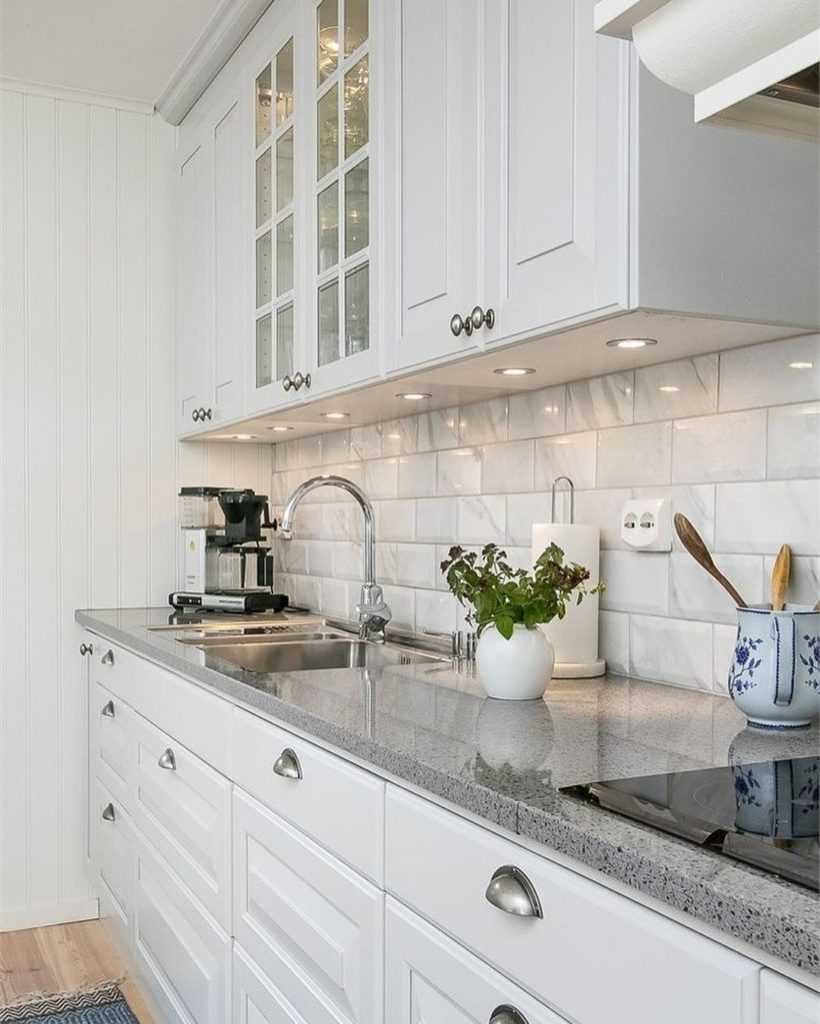 Белая кухня с серой столешницей под мрамор? Или наоборот: серая кухня, а столешница белая? Нужно ли внедрять дополнительный оттенок? Оформлять фартук можно разными методами, поэтому цветовую гамму следует выбирать, начиная со столешницы.