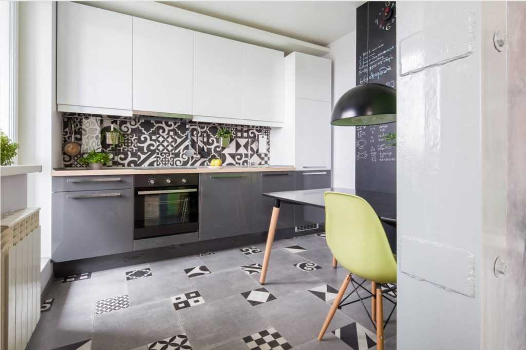 Это смелое решение поможет разнообразить пространство. Пользуемся контрастом: темное и светлое, матовое и глянцевое, с узором и без. Выполняем фасады в монохромном стиле и делаем сочный ярко-желтый элемент. Он выступит фокусной точкой в интерьере. Чтобы помещение смотрелось гармонично, добавляем пару акцентов в виде кружек, коврика или вазы в том же желтом цвете. Однако, не стоит перебарщивать с яркими цветами, иначе кухня будет смотреться дешево. Можно сделать проще и добавить матовый темно-серый фартук к жемчужным фасадам. При правильном подборе, такая кухня будет смотреться дорого.
