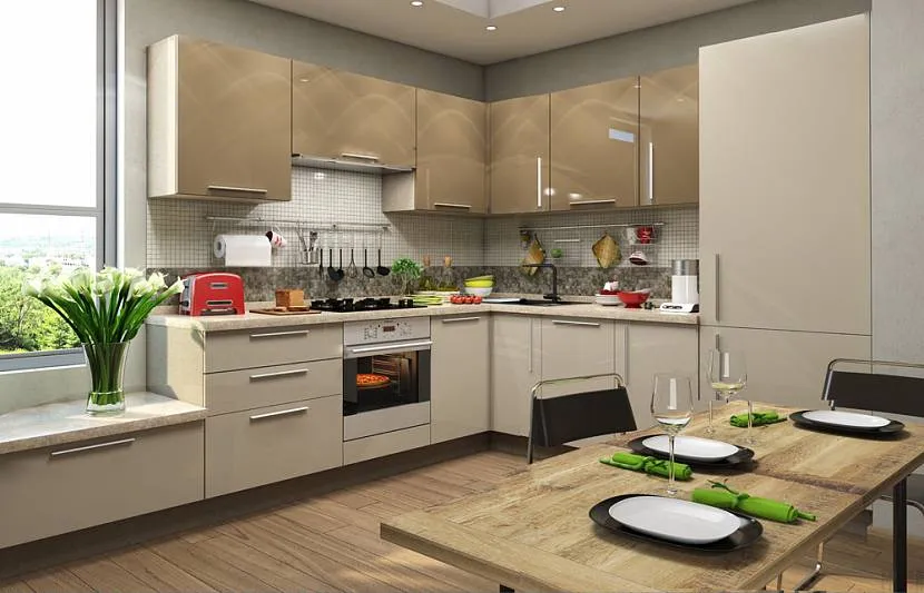 Конфигурация кухни или столовой должна обустраиваться таким образом, чтобы светлое отражение бежевых элементов не слепило глаза во время приема пищи. Поэтому лучше, чтобы блестящий фасад мебели оставался за спиной.