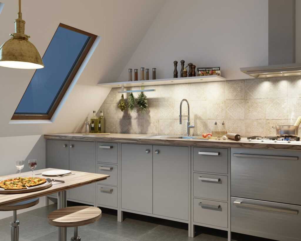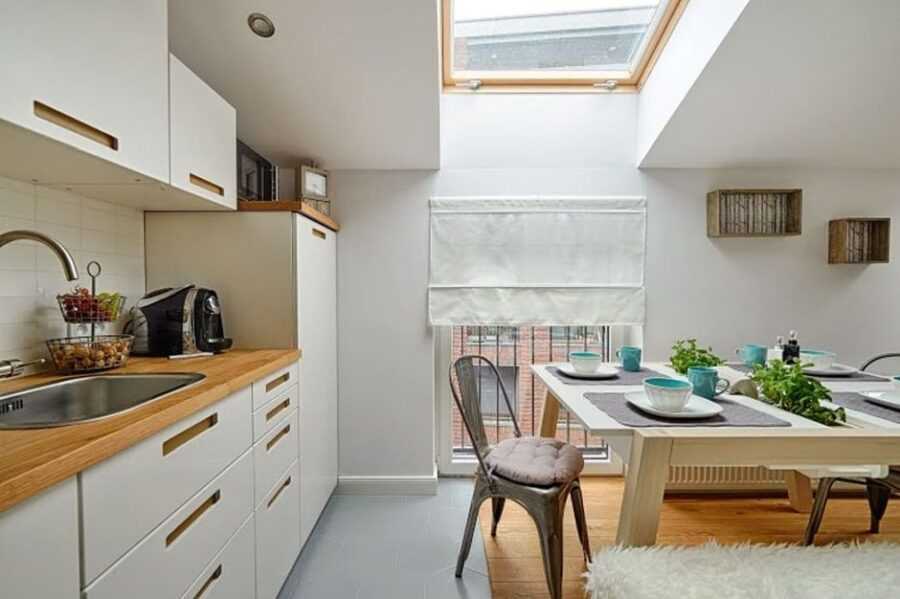 Для того, чтобы на кухню поступало нужное количество света, а также вентиляция — окна очень рекомендуются и даже необходимы. По расчетам и рекомендациям специалистов окна в мансардной кухне должны составлять 10 процентов площади пола.