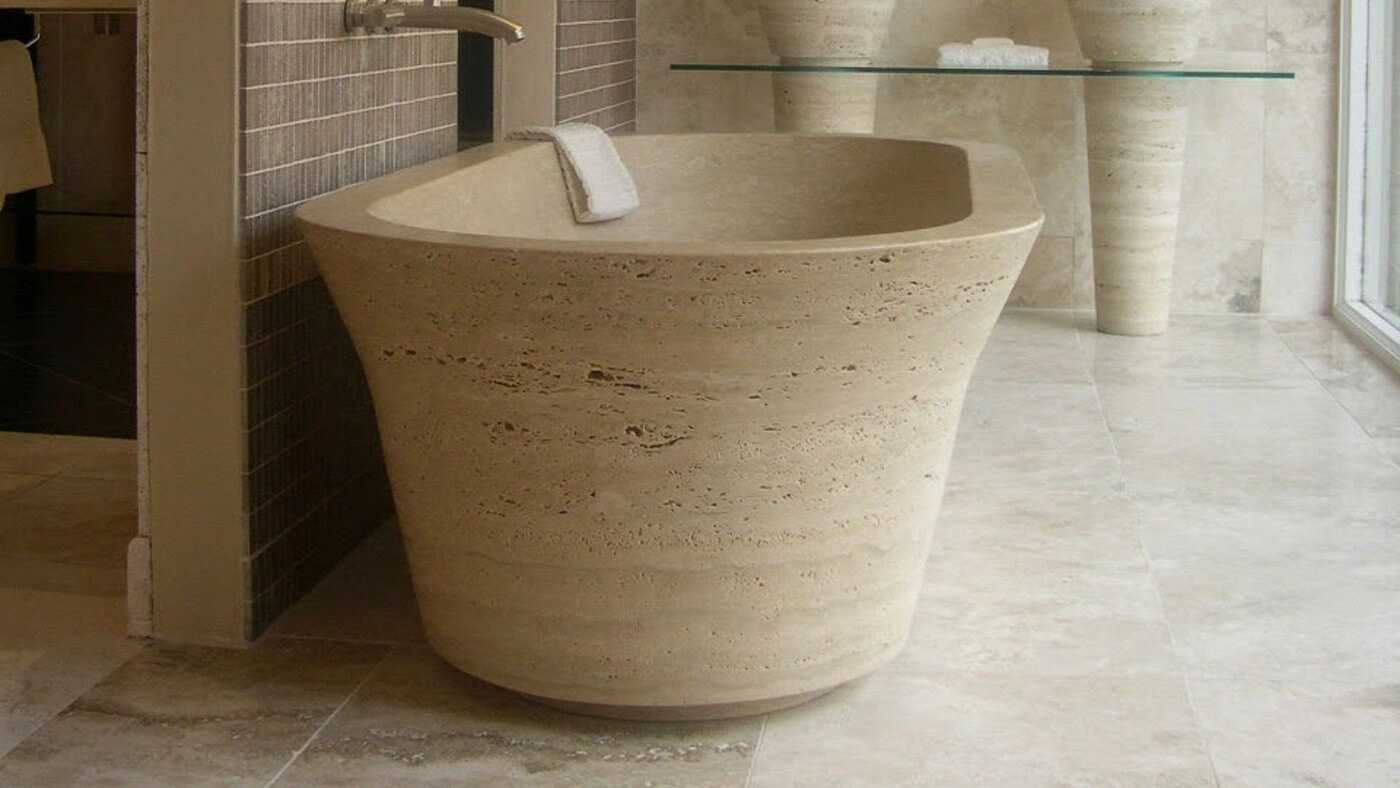 Чтобы использовать травертин в качестве материала для ванной, нужно запечатать его поры специальным составом. Камень перестанет впитывать воду, и за ним будет проще ухаживать