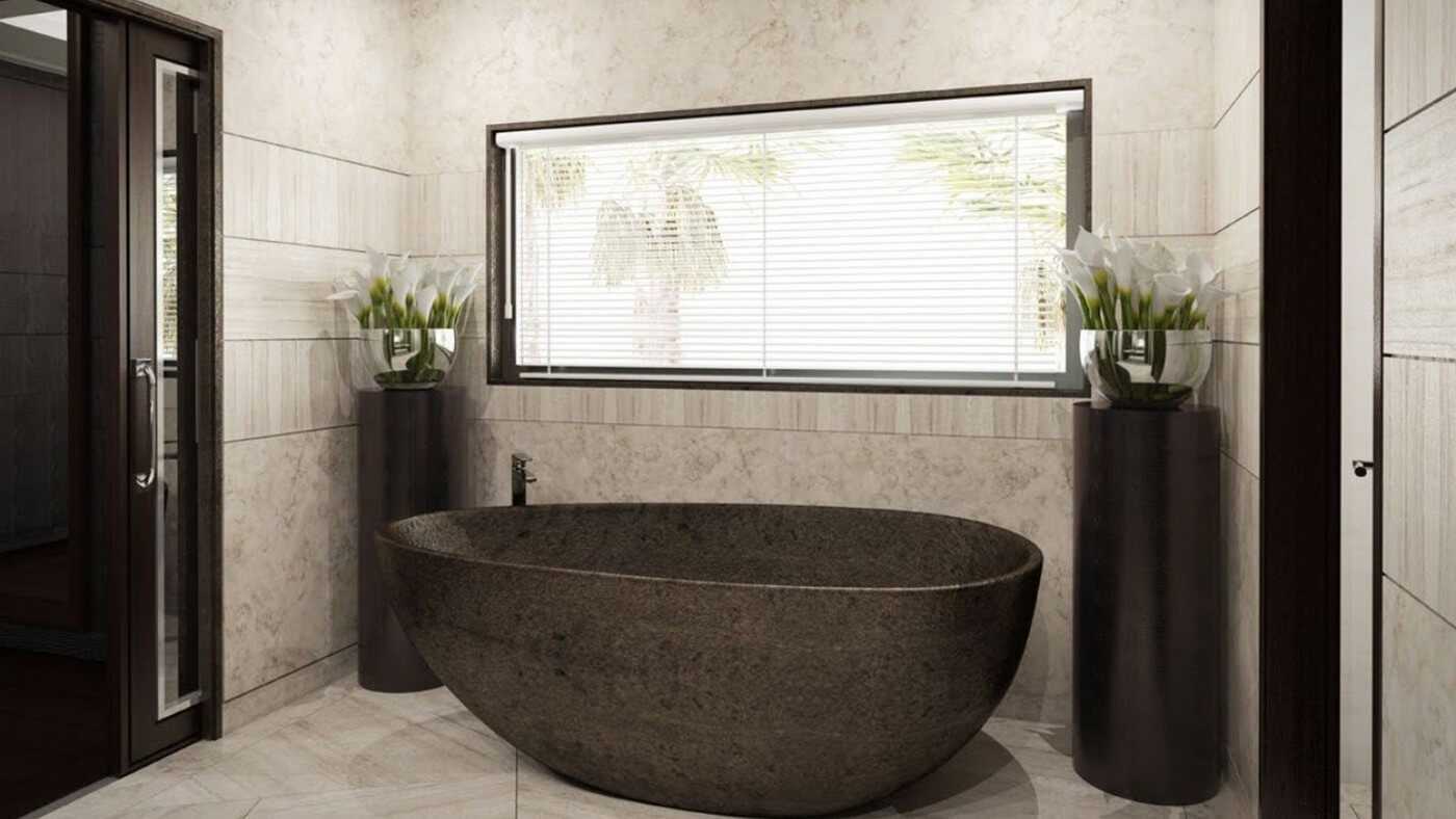 Если позволяет бюджет, ванна из цельного куска мрамора или травертина станет главной достопримечательностью дома, вокруг которой можно выстроить все остальные детали.