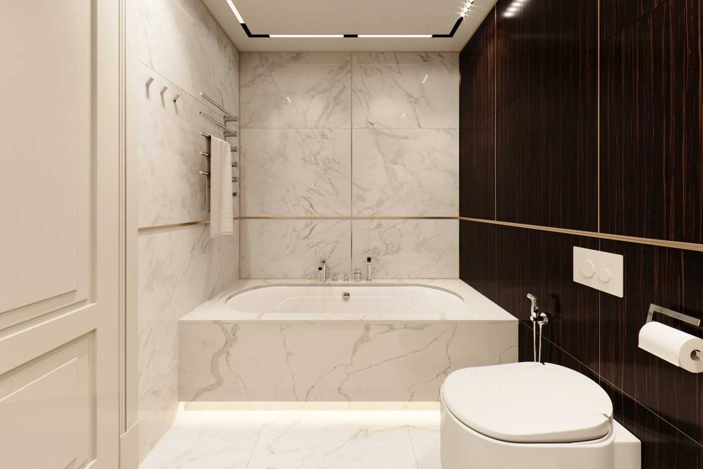 Совсем не обязательно обрабатывать все стены под мрамор — можно использовать, как в этой квартире, сочетание керамогранитных плит под мрамор и дерево. Проект квартиры «Кременчугская», дизайнер Евгений Жданов