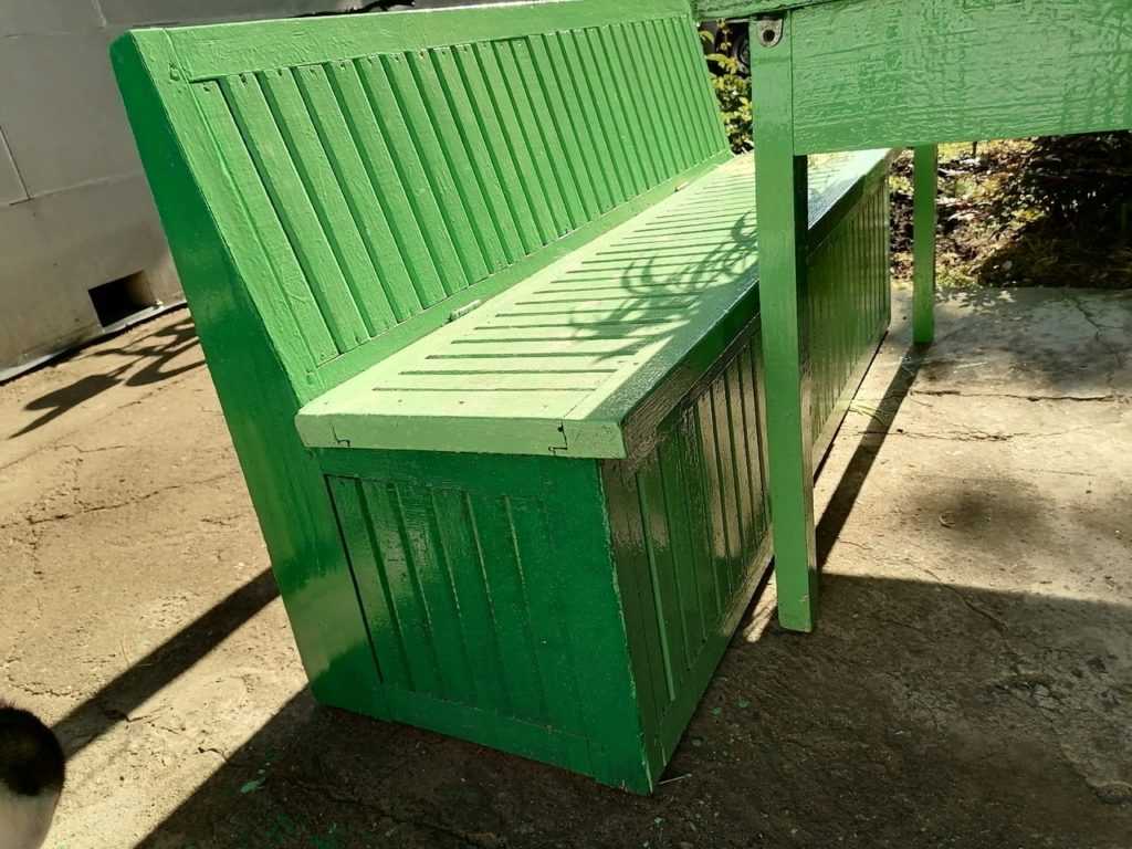 Внутри скамейка пустая, а сиденье можно поднять и положить что-то внутрь