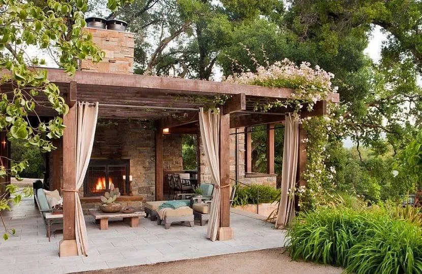 Название стиля заимствовано из английского языка, и в переводе означает не что иное, как «деревня». Стиль включает множество направлений, и беседка может выглядеть совершенно по-разному, в зависимости от того, колорит какой культуры был взят за образец. На загородных участках встречаются беседки, напоминающие русскую избу, английский коттедж, тропическое бунгало или американское ранчо. Главная черта, объединяющая все эти разнообразные строения — воссоздание сельского уюта. При оформлении беседки в стиле кантри используются разнообразные приемы: