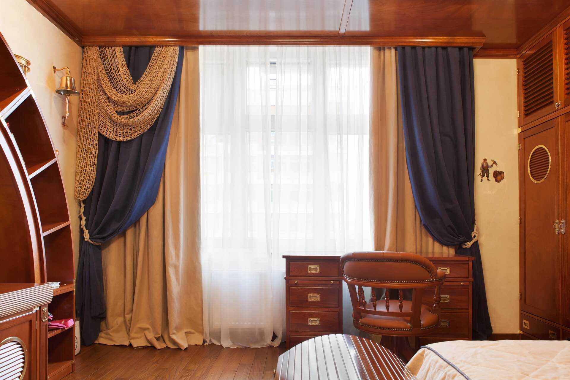 Синие портьерные ткани блэкаут и шторы разнообразных оттенков применяются в следующих помещениях: