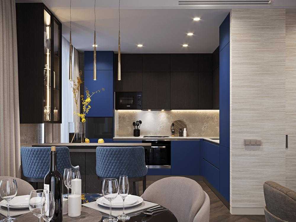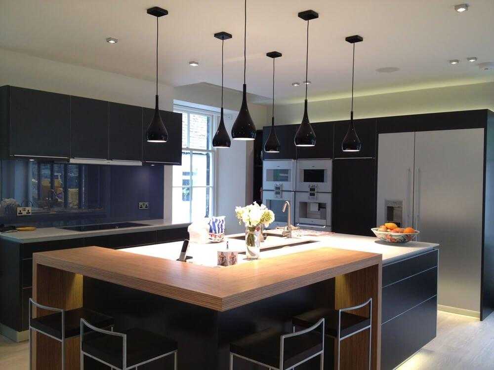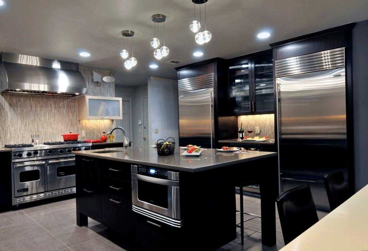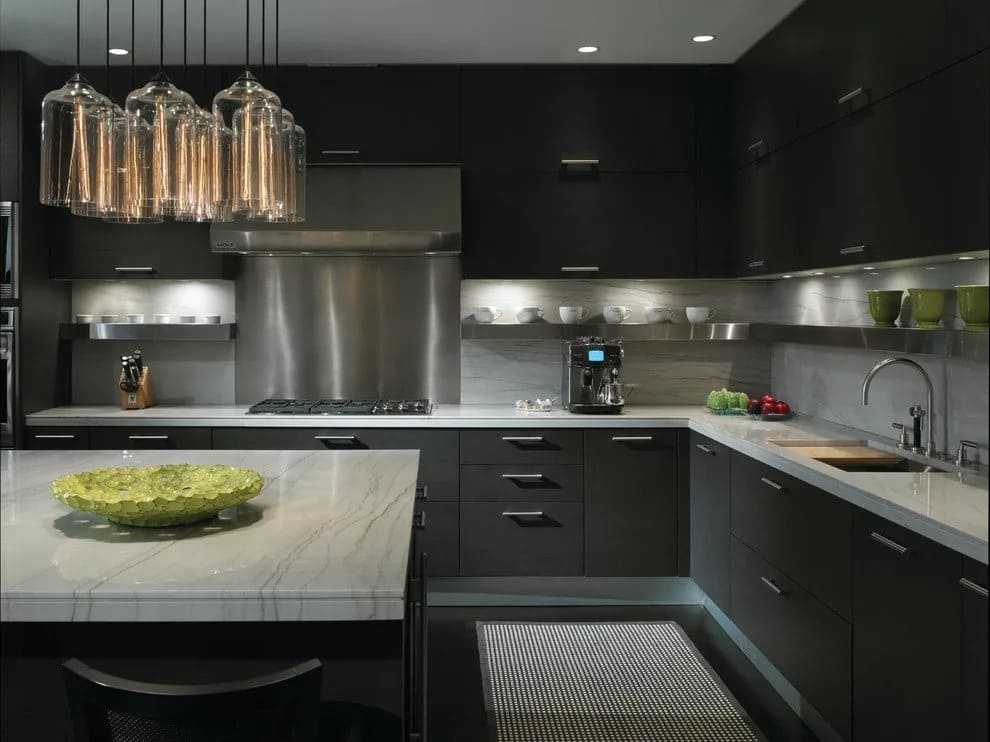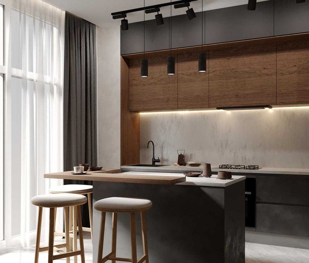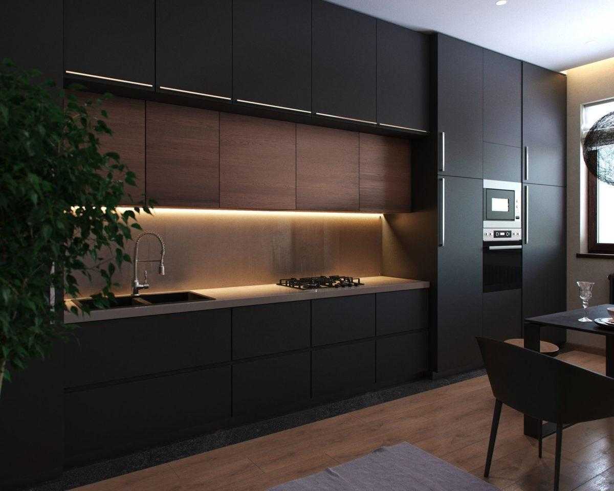 Дизайн тёмной кухни требует грамотно продуманного освещения, чтобы обстановка не получилась слишком сумрачной. Лампы лучше выбирать тёплого или нейтрального света: холодные могут сделать тон тёмных поверхностей грязным.