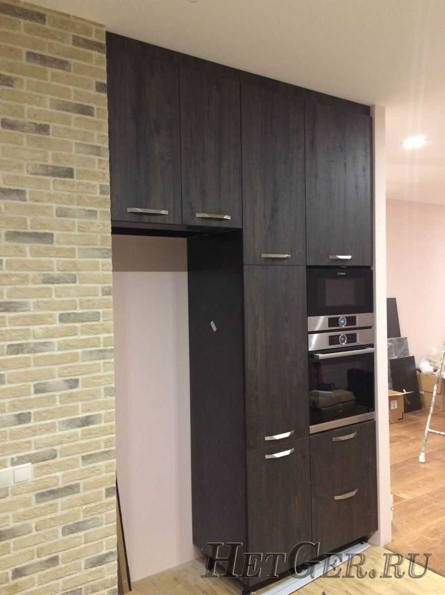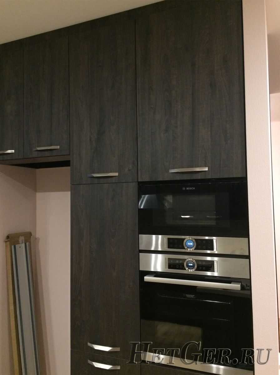 И с одной и с другой стороны шкафы до самого потолка. Фальшь панель в цвет фасадов обрамляет мебель и поможет защитить от скопления пыли.