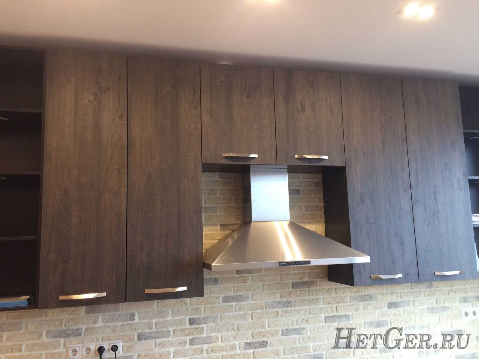 Верхний ярус шкафов очень вместителен, так как высота у них 1300 мм. В каждом шкафу по 4 полки. Шкафы закреплены на усиленных подвесах. Крайние шкафы без дверок для специй, бокалов, ваз и декоративных элементов.