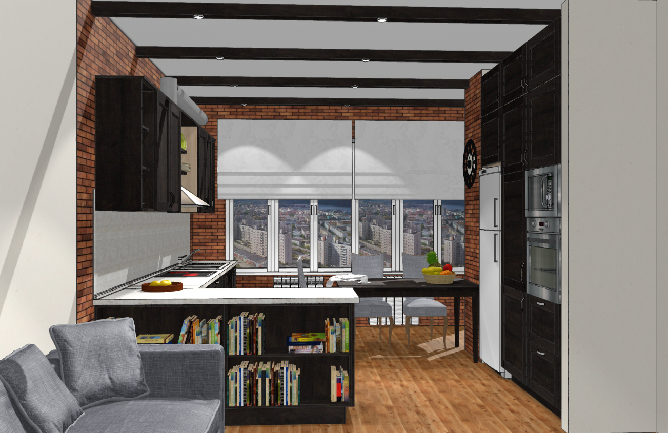 Изначально проект кухни задумывался в стиле лофт, который по мере работы над ним менялся под потребности и просьбы хозяев. В итоге кухня получилась брутальной, вместительной, функциональной с намёком на лофт.