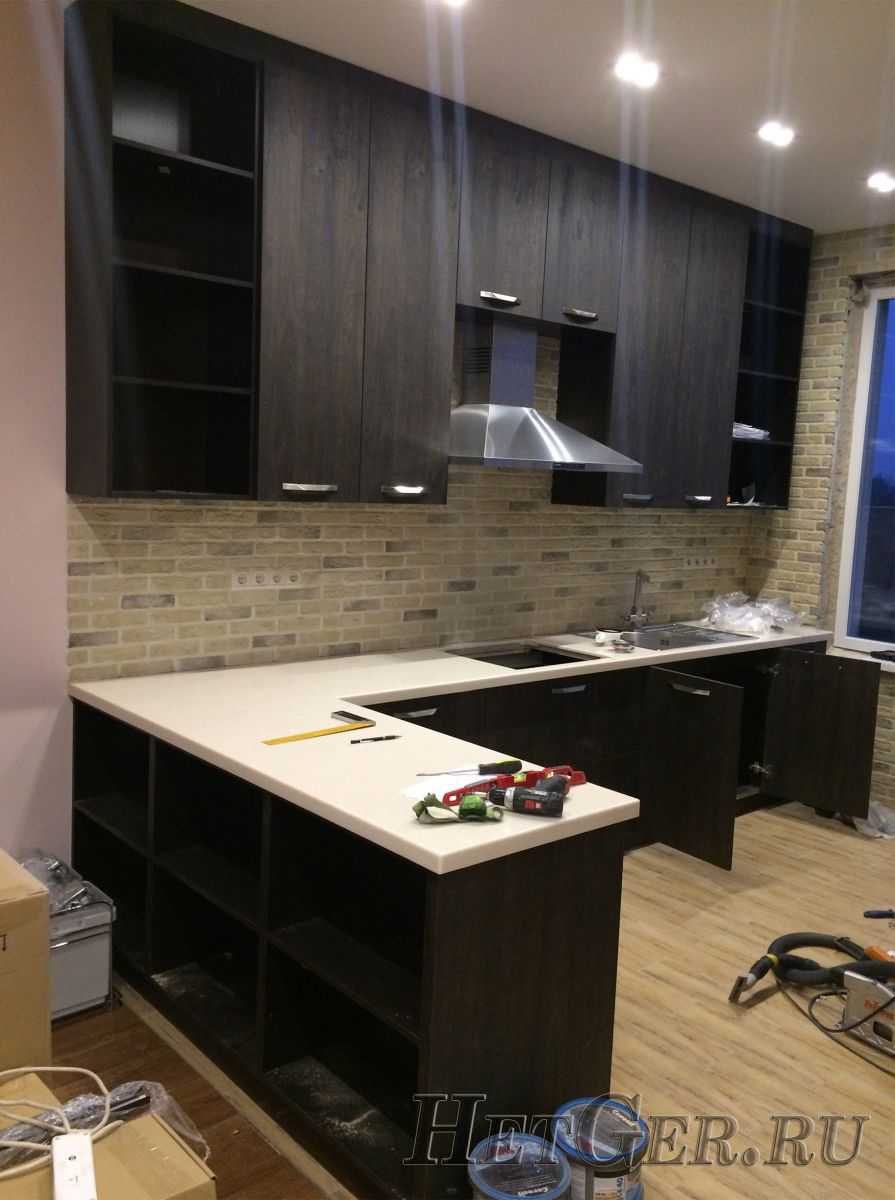 Столешницы и фартук выполнены из натуральных материалов (гранит, мрамор) или сделанные под них.
