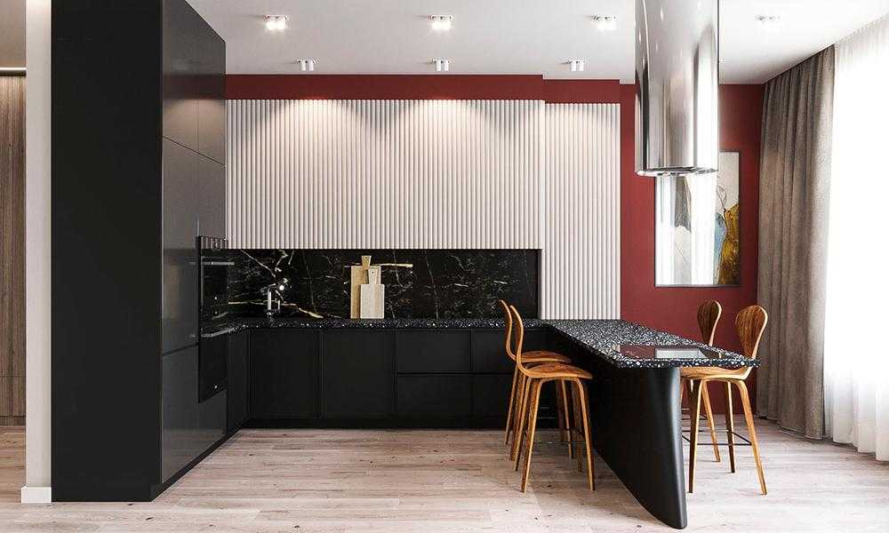 Для тёмного гарнитура отделку стен подбирают сходную по цветовой температуре (холодную или тёплую). Наиболее выразительно гарнитур смотрится на фоне светлых стен – бежевых, белых или цвета слоновой кости.