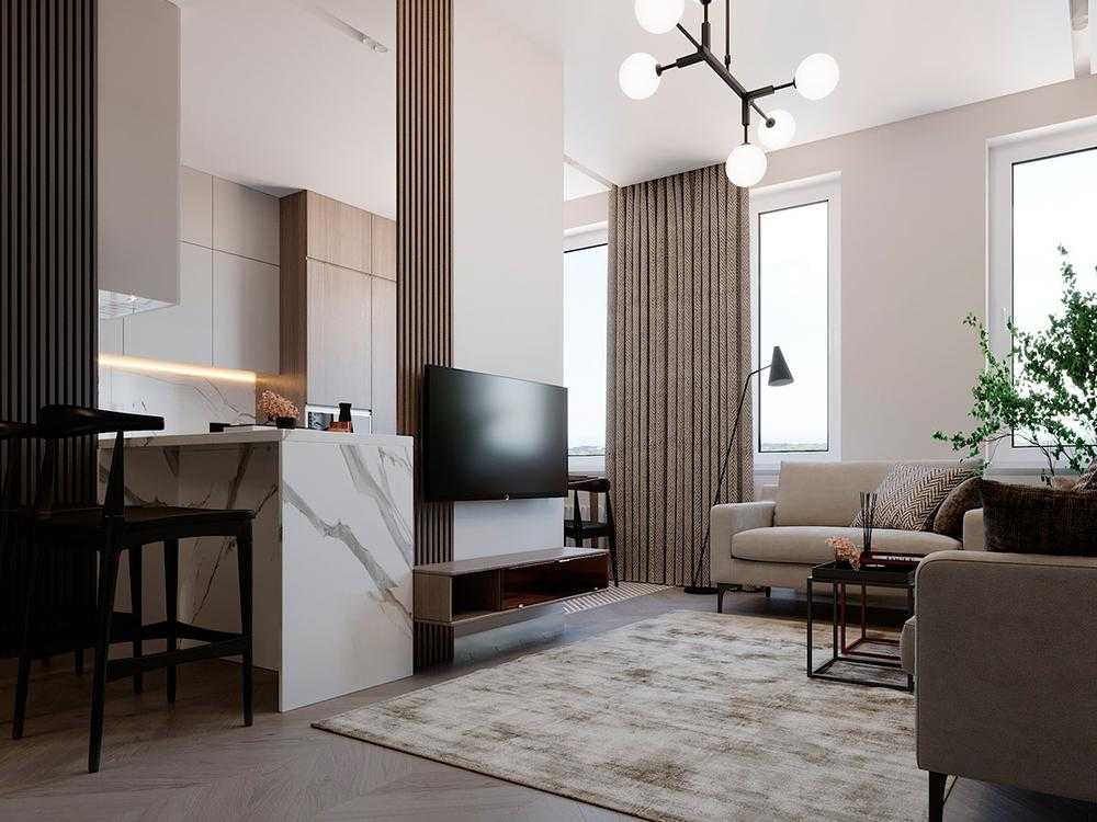 Квартира студия, в которой нет дверей, но выделены зоны для отдыха, сна, приёма гостей и приготовления еды. Кухня совмещена с гостиной. Зоны разделены не только функционально, но и визуально.