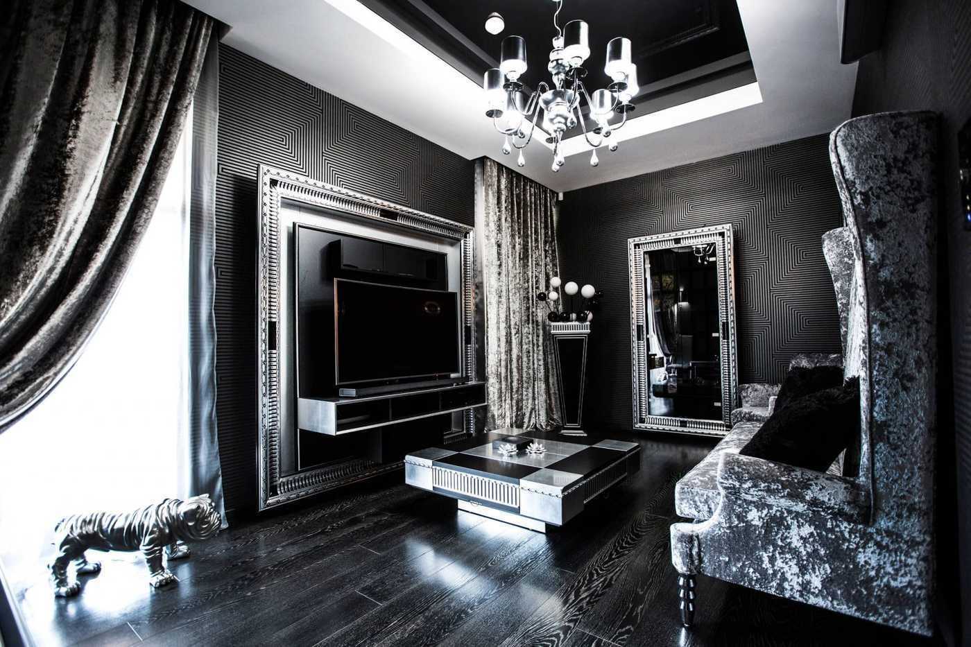 - Черные обои в интерьере гостиной также могут стать акцентом, но не фоном. Гармоничными в черно-белом дизайне будут классические варианты с белым рисунком, а также покрытия с серебристым или просто серым орнаментом. К слову, серебристый узор органичен в стиле ар-деко, где используются зеркала с рамами в металлических оттенках.