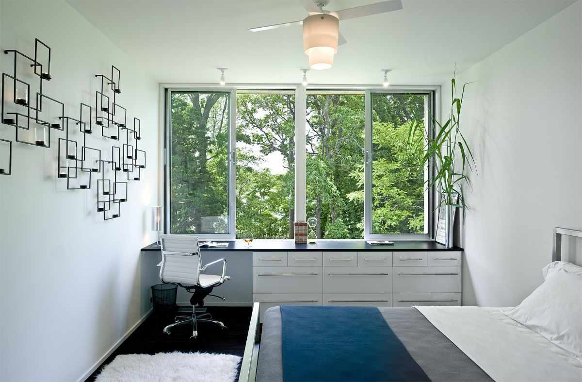 Еще один вариант оформления подоконника в спальне, — дополнительное рабочее место. Не каждый дом может похвастаться наличием кабинета. В тишине и спокойствии спальни будет удобно работать. Украсить «рабочий стол» можно необычной лампой, рамочками с фотографиями, старинными настольными часами.