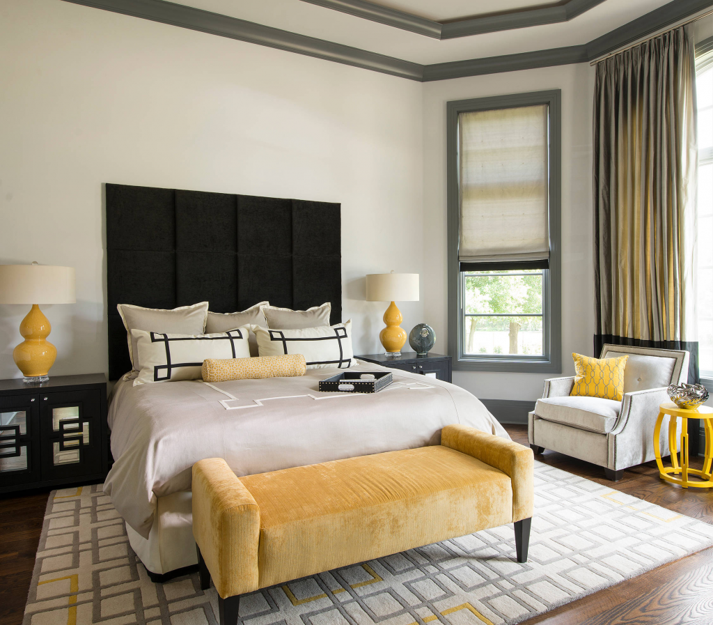 Желтый в спальне дарит ощущение солнечности. Приемлем в сочетании с черным, зеленым, коричневым. Лучше не использовать в паре с голубым, розовым и бордовым. Также стены в спальне можно покрасить в коралловый цвет. Осветительные приборы, возможно плед на кресле и картины лучше выбрать оранжевые. Все это можно разбавить белыми или черными фоторамками, коврами и шторами. Цвет дверей должен быть насыщенным.