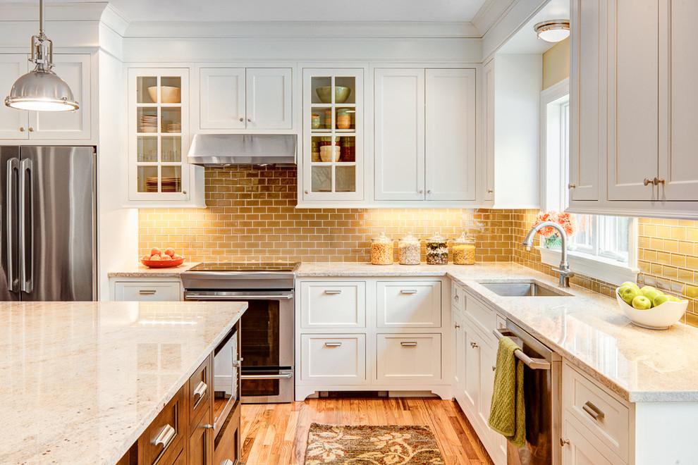 Если предпочтение отдается керамической плитке, ее узор должен гармонировать с основным оттенком гарнитура. Также расцветка плитки может совпадать с колером столешницы, но не забывайте о безопасности, выбирайте шероховатые поверхности.