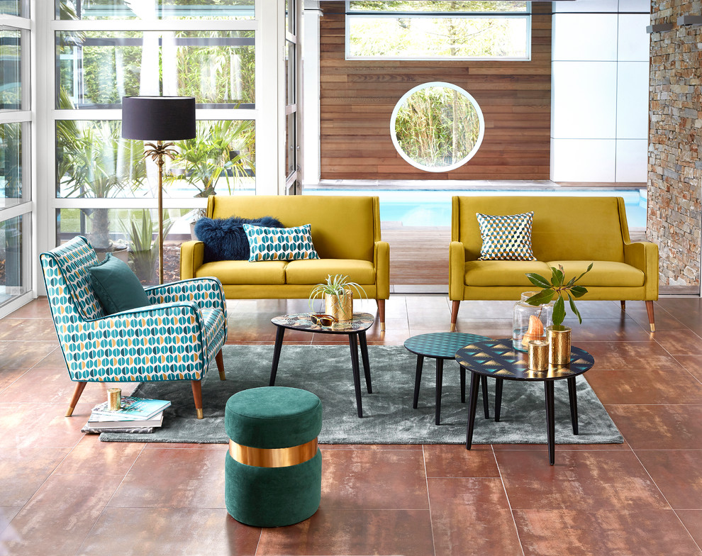 Применим в сочетании с модными цветами в дизайне интерьера 2020 года: персиковым (ярким) и глубоким синим, что делает комнаты более привлекательными и веселыми.