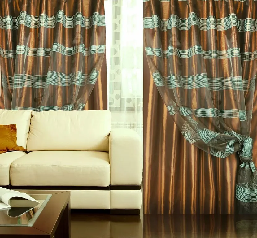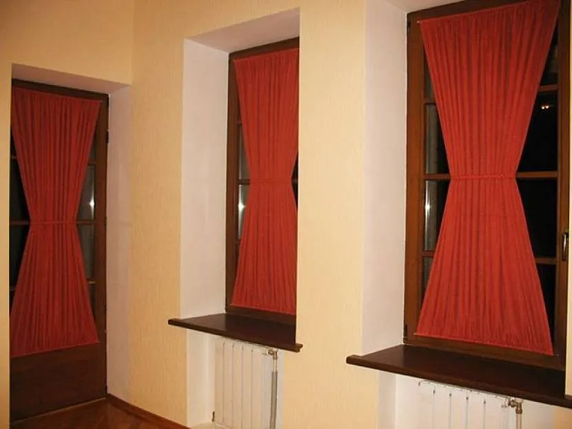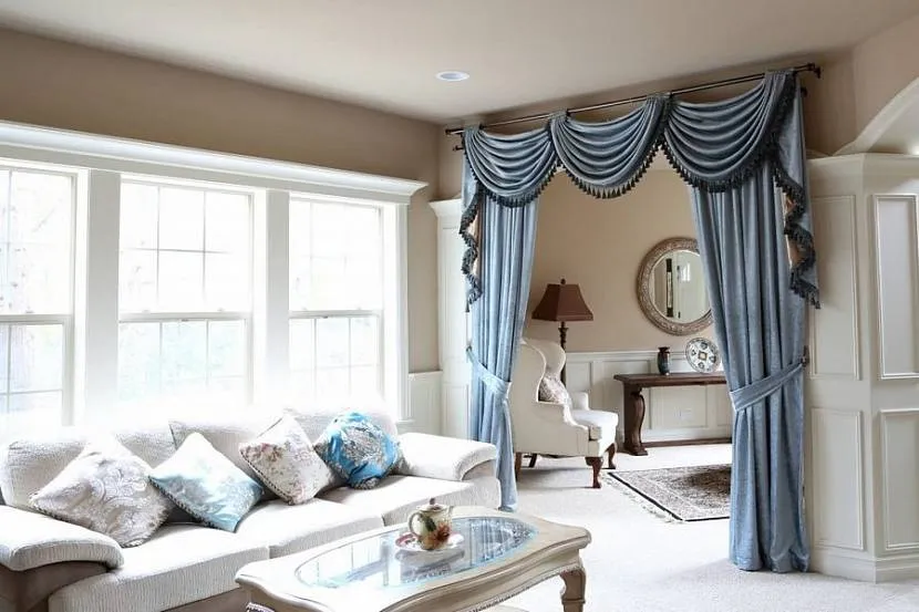 Межкомнатные шторы отображают в себе эти стилистические особенности. Органично впишутся в интерьер классические полотна, сложные шторы. Арочные проёмы, эркеры — характерный элемент классицизма. Их можно оформить с помощью итальянских полотен. Уместны декоры в виде подхватов, украшений типа кистей, бахромы. Эркерную часть зонируют с помощью штор, гардинного полотна, которые дублируют цвет и фасон занавесей на окнах. Для оформления дверей со стеклом уместны полотна типа «песочные часы».