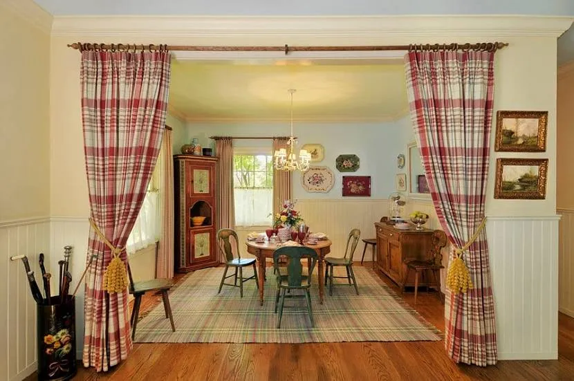 Дверные занавеси из лёгких натуральных тканей с рисунками хорошо смотрятся в таких интерьерах. Полотна с рюшечками, воланами, бантиками создают атмосферу домашнего комфорта.
