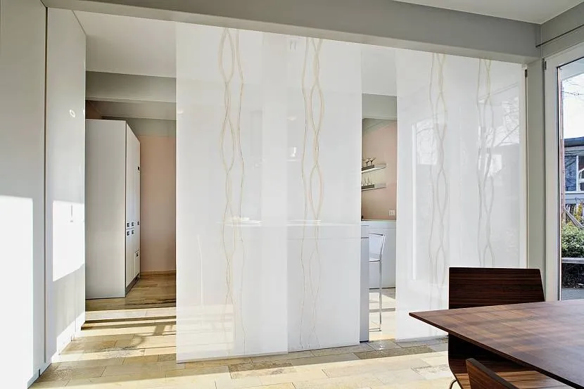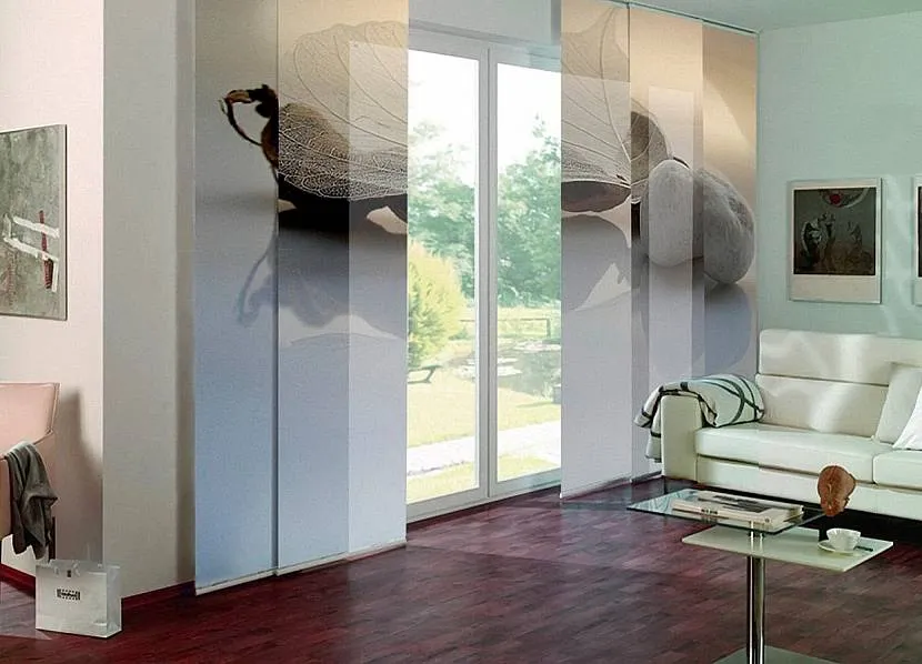 Естественно вписываются в интерьер шторы-жалюзи, «римки», японские ширмы. Тканевые полотна простой формы вешают на струнные, хромированные карнизы.