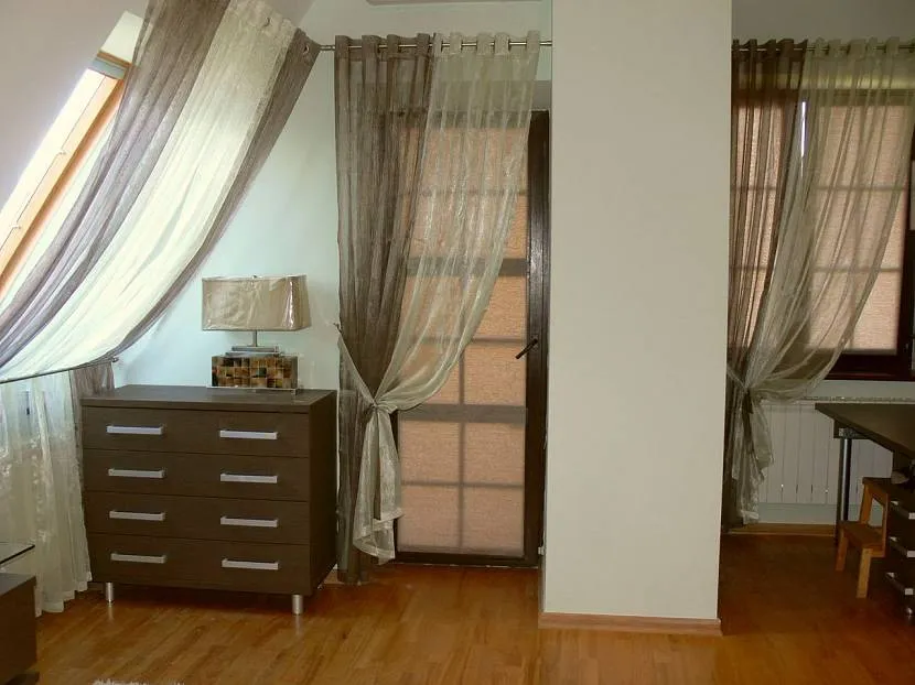Двери со стеклом выглядят привлекательно с эстетической точки зрения, пропускают свет. Шторы на них выполняют маскировочную функцию, служат завесой.