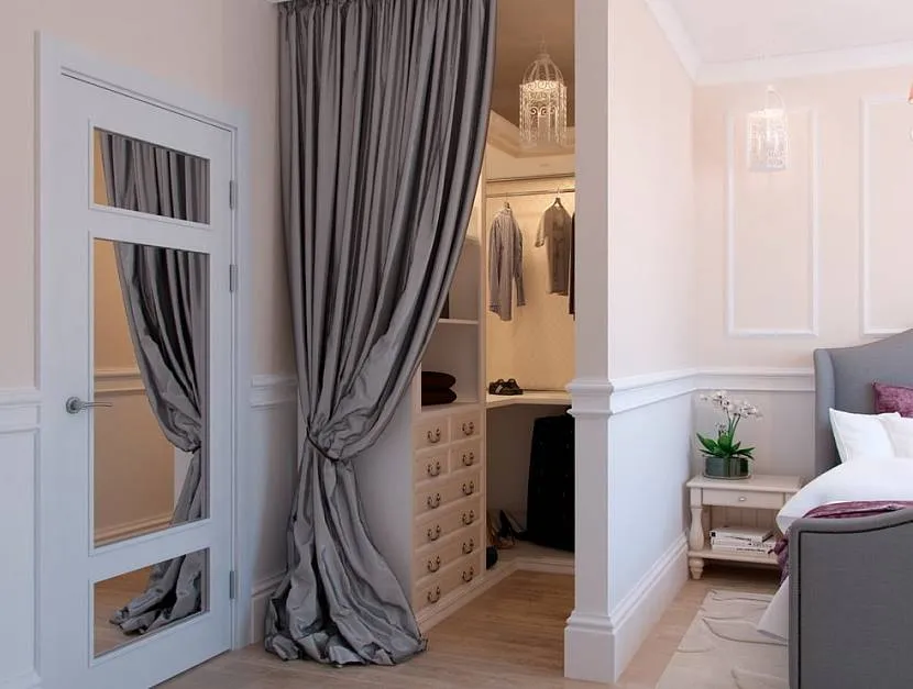 В проходных комнатах установка дверей не всегда уместна, особенно в небольших по квадратуре квартирах. Дополнительный дверной блок визуально сужает пространство. В качестве альтернативного решения можно вход в переходное помещение оформить занавесками.