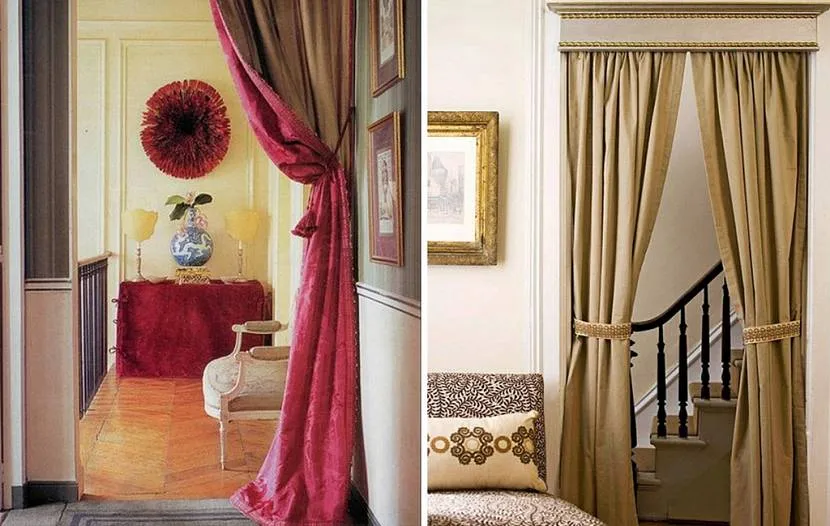 - Украсить дверной проём текстилем легче и дешевле, чем установить дверной блок.