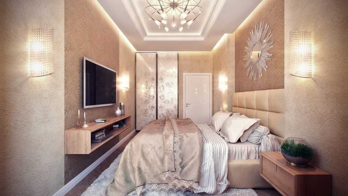 - Спальня. Для этого помещения используют преимущественно материал на натуральной основе, выбирают продукцию в светлых тонах. При использовании декоративной штукатурки для спальни можно выбрать как однотонную фактуру, так и разновидность с орнаментом; требуется, чтобы он имел преимущественно плавные линии и гармонировал с мебелью и шторами.