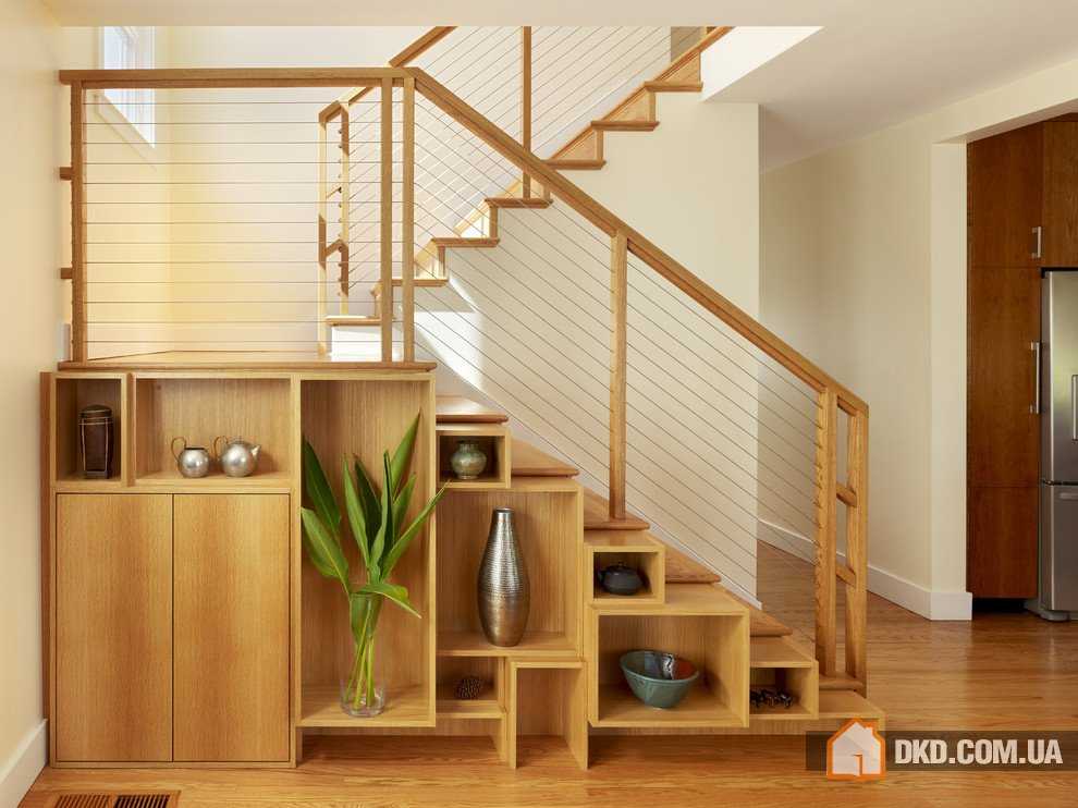 При использовании подлестничного пространства важно решить, полки там будут или ящики. Дизайнеры сходятся во мнении, что хаотично расположенные ящики и полки вместе создадут ощущение безвкусия и беспорядка. В полках или ящиках можно хранить различные мелкие вещи, посуду, одежду, коллекцию вин, инструменты и многое другое