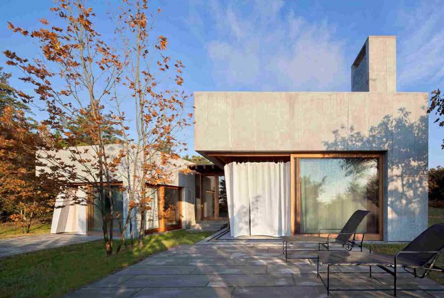 Крыльцо современного дома построено их бетона, дерева и стекла
