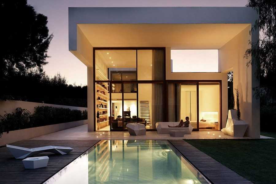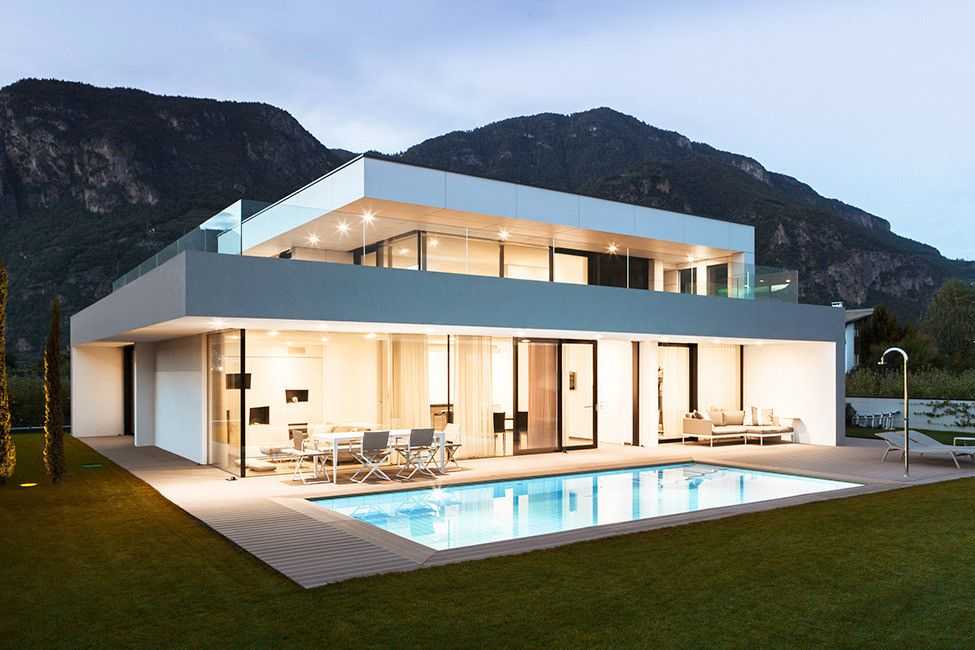Стекло и бетон. Комбинацию этих материалов нередко можно увидеть в оформлении дома в современном стиле. Большие панорамные окна дают возможность наслаждаться окружающей природой, пропускают в помещение много света и при этом смотрятся стильно