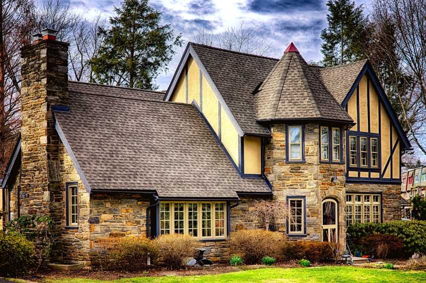 - Тюдоры. Коттедж, построенный по канонам архитектуры Тюдоров, выглядит основательным, строгим, надежным. Особенность данного направления – совмещение каменной отделки и технологии фахверк, высокие фронтоны, асимметрия здания, мелкий оконный переплет.