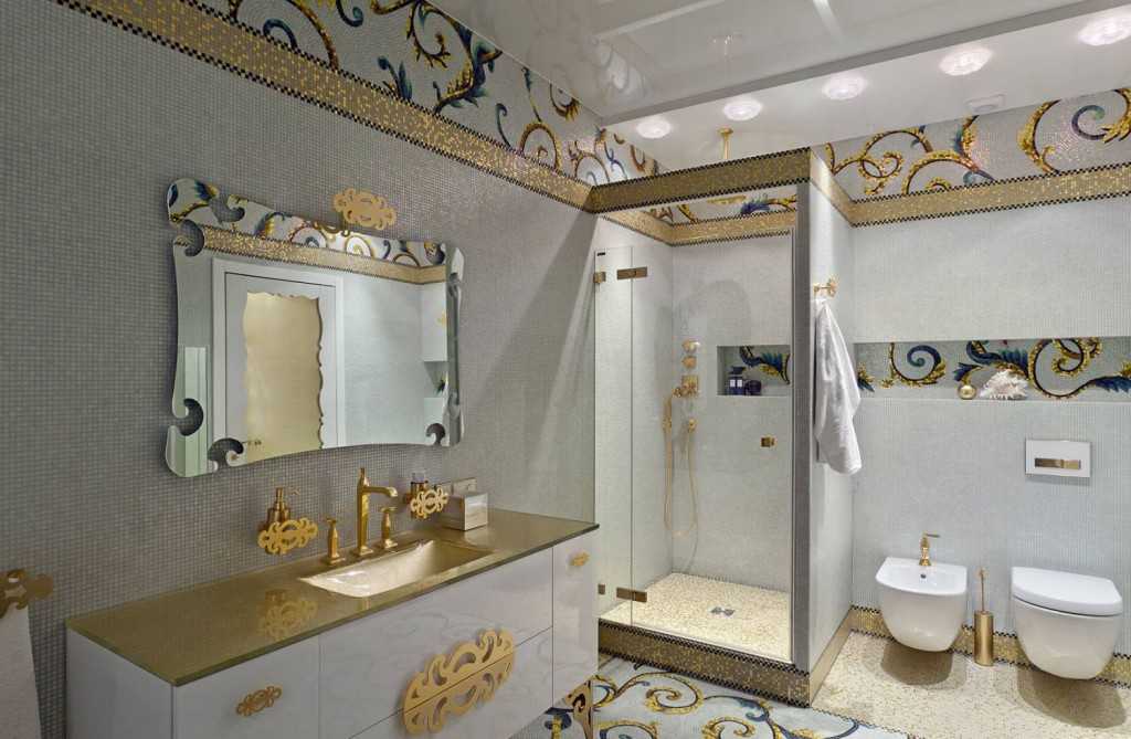 Если санузел не совмещенный, то дизайн для ванны с мозаикой, рекомендуется разбивать на зоны, подбирая панно. Мозаикой ванную комнату можно выложить разноцветными волнами. Мозаика благодарный материал и облицевать ею можно поверхность любой формы — круглой, овальной, что практично для помещения, где стены не отличаются абсолютной ровностью.